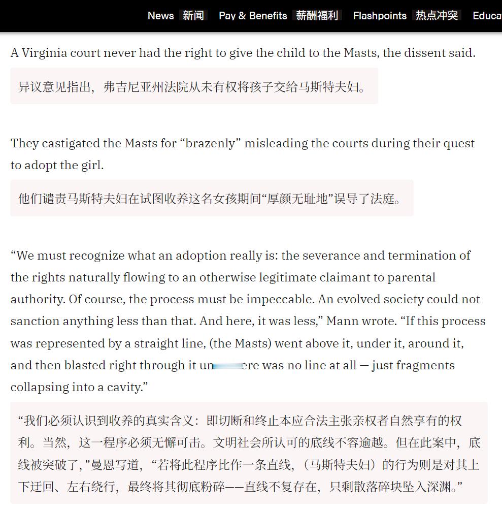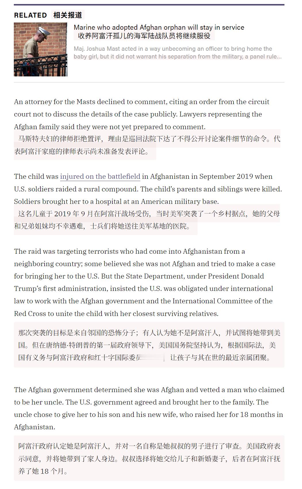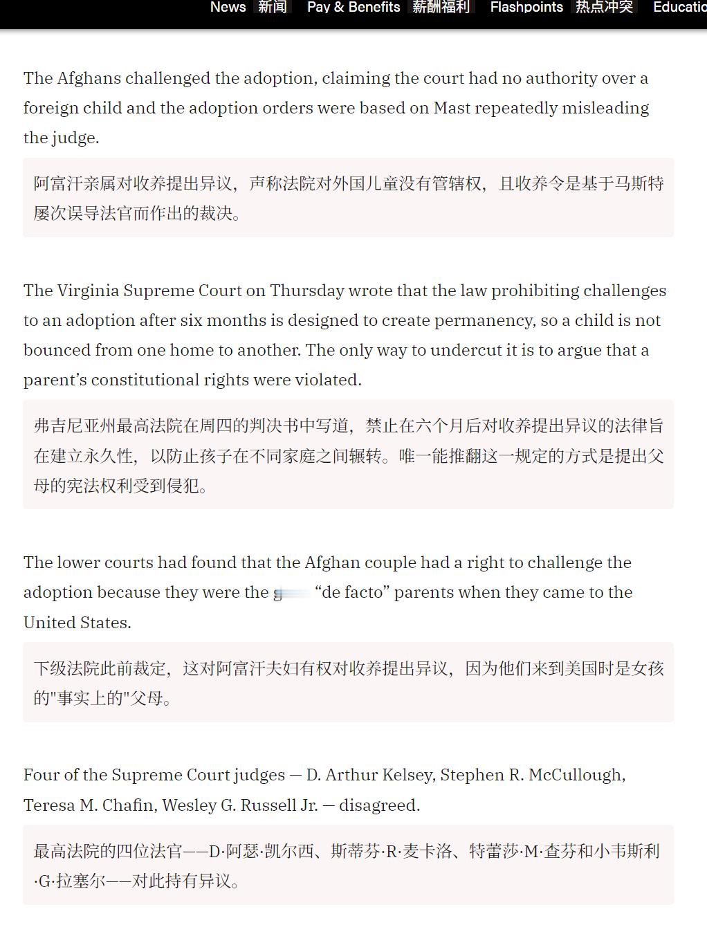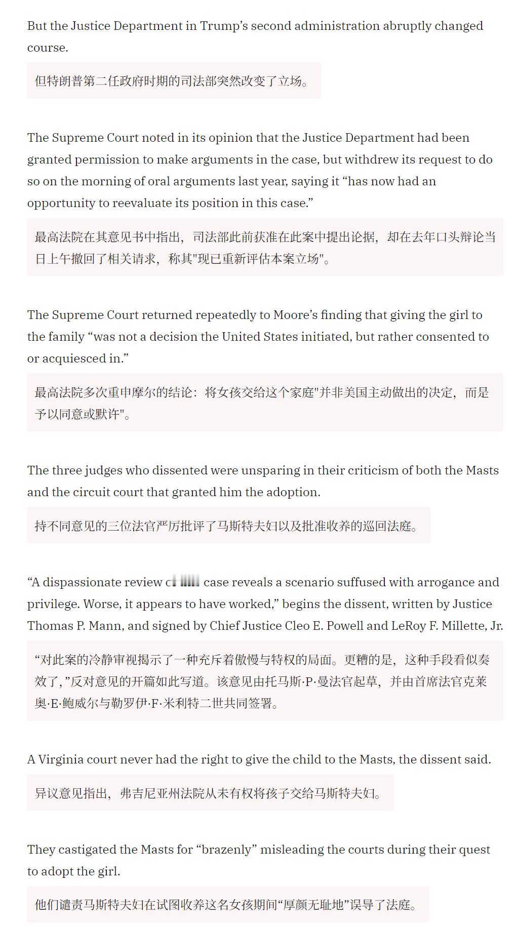 🔻抽象新闻一则:弗吉尼亚州最高法院裁定美国海军陆战队员“收养”阿富汗战争孤儿有效。🔻这个女孩的父母和兄弟姐妹死于美军突袭,然后,这名美国海军陆战队员从女孩的亲属手中以美国法院判决带走了孩子。🔻阿富汗亲属作证称:他们对美国法官将女孩判给另一美国家庭毫不知情。🔻另外,一个由三名成员组成的美军陆战队委员会认定,尽管乔舒亚·马斯特少校在试图将这名女婴带回家的过程中有失军官身份的行为,但这不足以让他离开军队,他将继续保持美军现役身份。🔻马斯特和他的妻子斯蒂芬妮当时住在弗吉尼亚州弗卢万纳县的农村地区。他们说服那里的一名美国法官批准他们收养这名孩子,即使她仍留在阿富汗,因为阿富汗政府正在寻找她的其他亲属并让她与他们团聚。🔻马斯特在塔利班于 2021 年接管阿富汗后,帮助这个家庭离开了阿富汗。一抵达美国,马斯特就利用美国法庭的收养文件让联邦政府将孩子从她的阿富汗亲属身边带走(这些亲属在阿富汗养育了她 18 个月),并交给了马斯特。🔻via 军事时报热点现场海外新鲜事