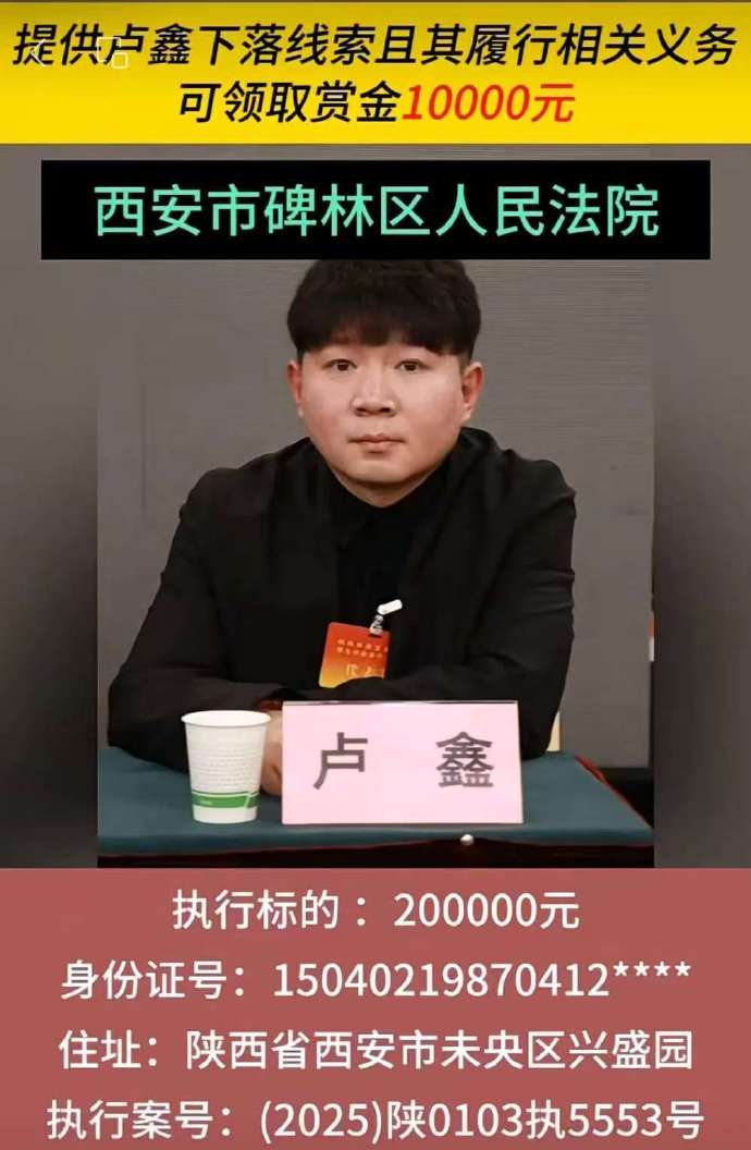 2月11日17时54分,西安市碑林区人民法院微信公号发布执行悬赏公告(2026年第5期),将被执行人卢鑫的照片头像、身份证号码前14位、住址等信息公布,该案执行案号为:(2025)陕0103执5553号,执行标的为20万元。