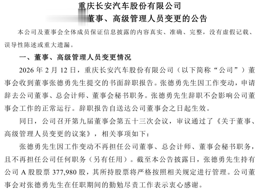 2月12日,重庆长安汽车股份有限公司(下称“长安汽车”)对外发布一则《关于公司董事、高级管理人员变更的公告》。公告内容显示,长安汽车董事会收到董事张德勇提交的书面辞职报告,因工作变动,张德勇申请辞去公司董事、总会计师、董事会秘书职务,且不再担任公司任何职务(另有任用)。