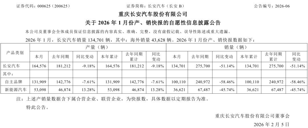 最新数据显示,2026年1月,长安汽车销量为134701辆,同比下滑51.14%。其中,自主品牌销量为100110辆,同比下滑58.46%;新能源汽车销量为36621辆,同比下滑45.74%;海外销量为43628辆。