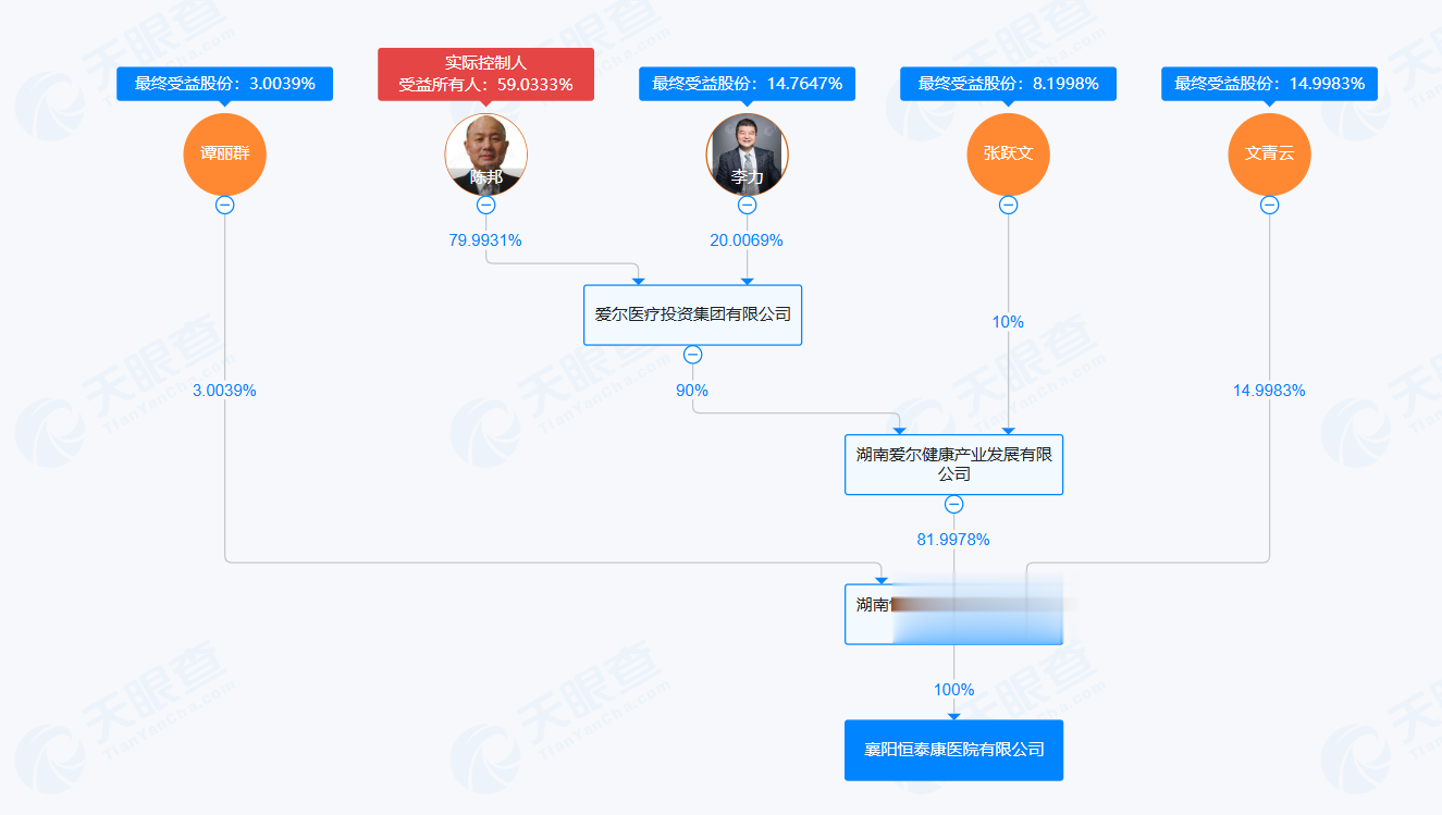 据天眼查股权穿透,襄阳恒泰康医院的最终实控人为爱尔眼科(300015.SZ)实控人、董事长陈邦。