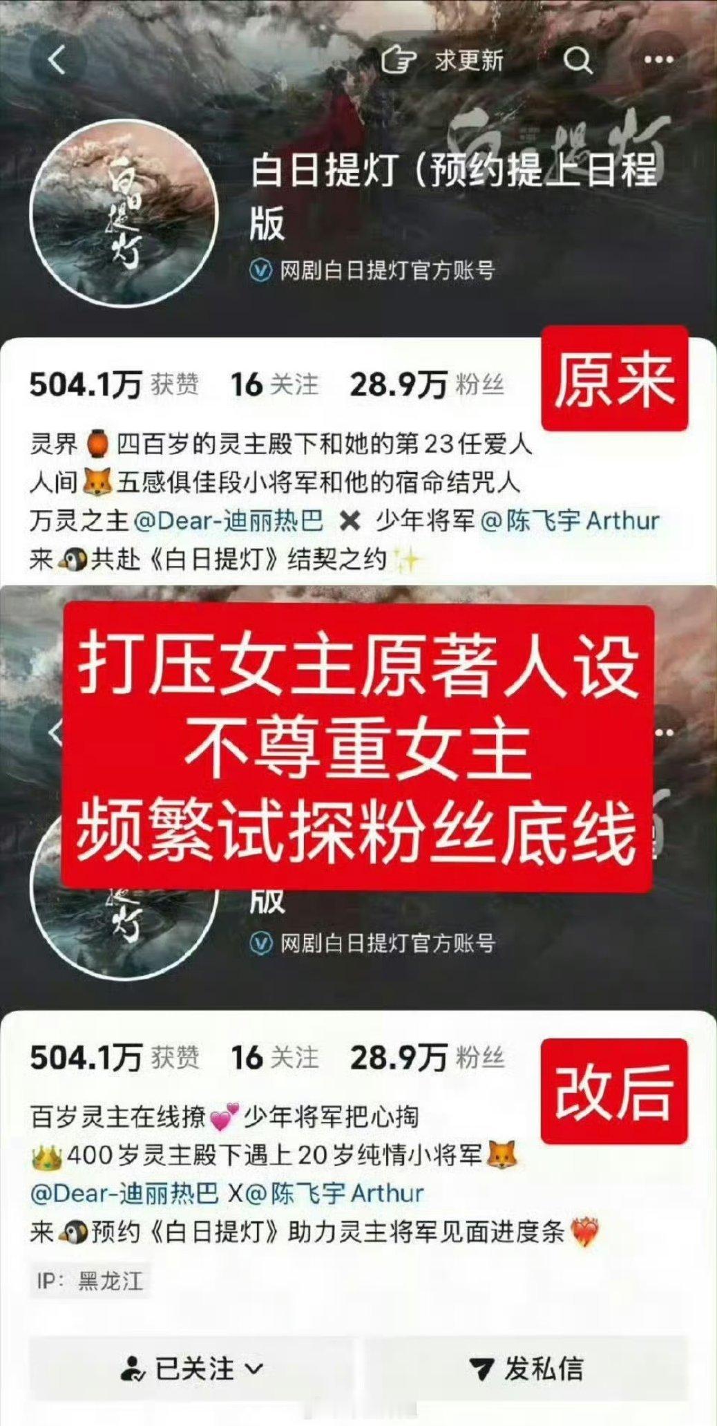 迪丽热巴跟陈飞宇主演的《白日提灯》dy官方修改了简介,结果迪丽热巴粉丝就觉得这是打压女主原著人设,不尊重女主