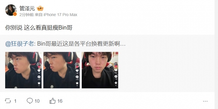 直播吧2月13日讯 今日,BLG上单Bin在抖音上分享了自己的照片,对此解说管泽元也更博表示:你别说这么看真挺瘦Bin哥!