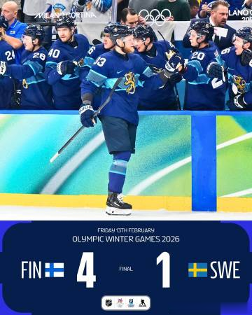 虎扑02月13日讯米兰冬奥会男子冰球小组赛B组第二轮比赛已经结束一场比赛,芬兰4-1战胜瑞典。