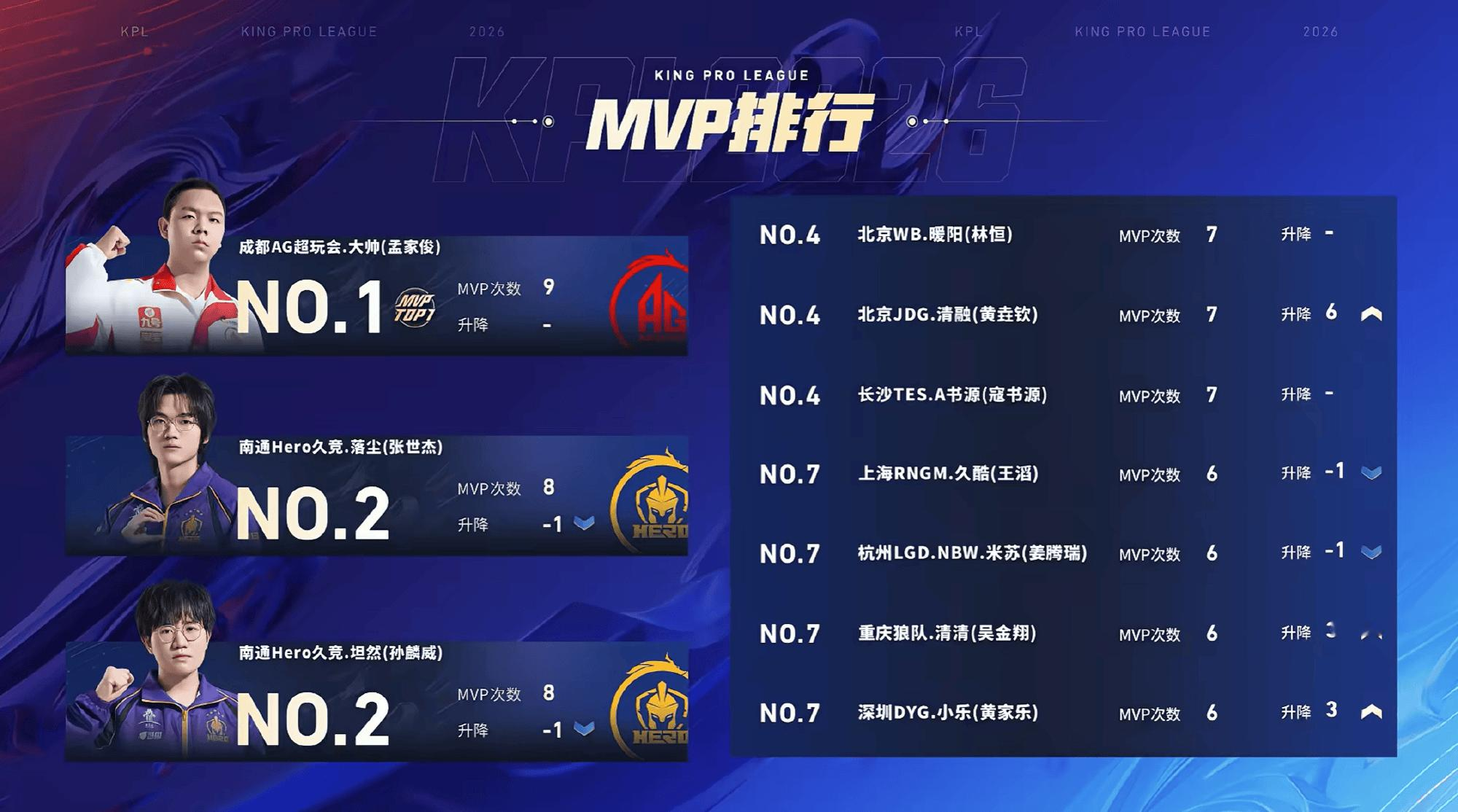 JDG清融v(黄垚钦)排名上升6名,累计获得7次MVP,与北京WB暖阳(林恒)、长沙滔搏丶书源(寇书源)并列第四。