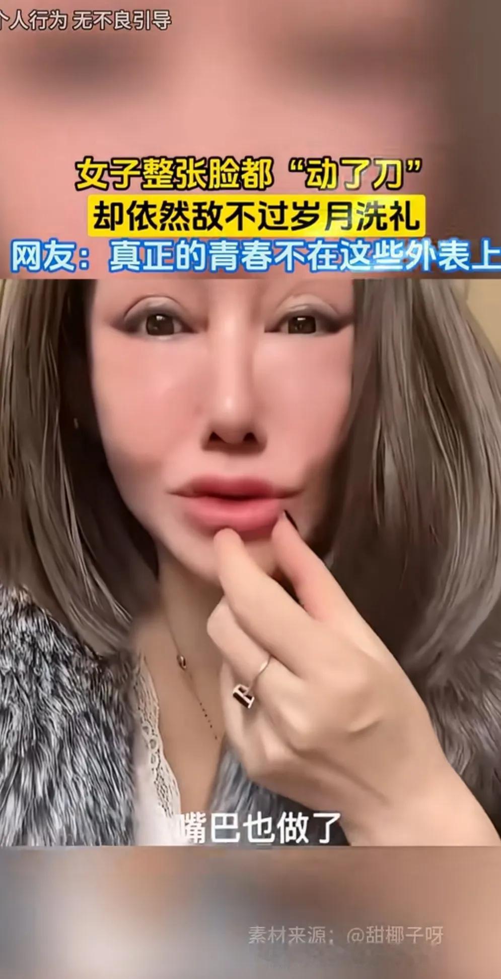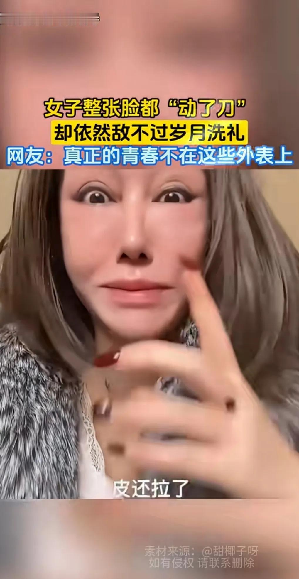 女子想保持年轻漂亮,切了眉毛,做了眼袋,拉皮三次,连嘴巴也整了。 戴上假发,貂也穿上了,除了一张整容脸,没有一点显年轻漂亮的影子。 还不如自然衰老看着顺眼。