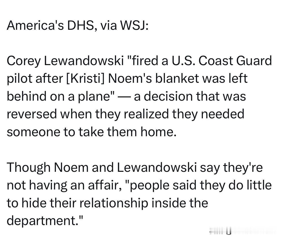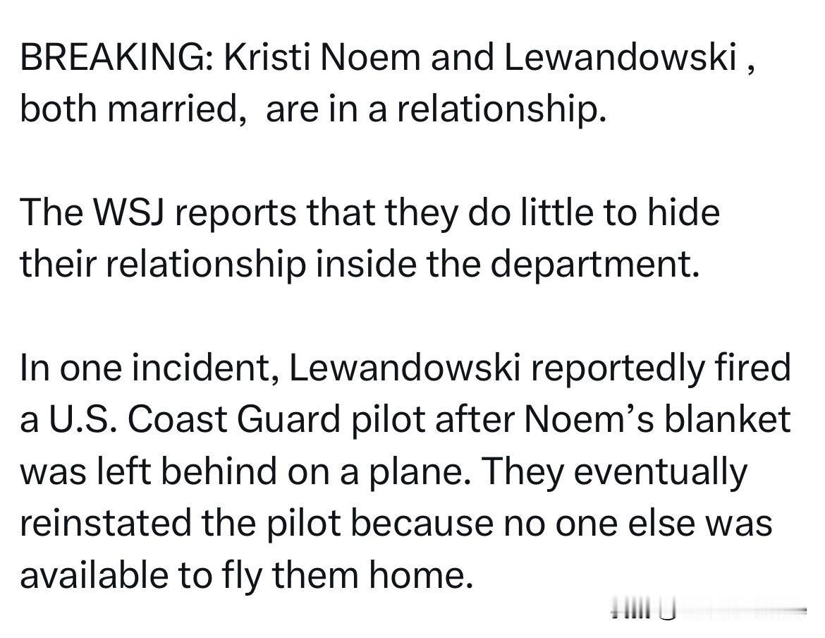 已婚的部长诺姆和前竞选经理莱万多夫斯基正在交往。 华尔街日报报道突发新闻:国土安全部部长诺姆Kristi Noem和前特朗普竞选经理Lewandowski都是已婚状态,但是二人目前正在谈恋爱,互相交往中。 《华尔街日报》报道称,他们在部门内部几乎毫不掩饰彼此的关系。 据报道,有一次,诺姆的毯子被遗落在飞机上,莱万多夫斯基因此解雇了一名美国海岸警卫队飞行员。后来,由于没有其他飞行员可以送他们回家,他们最终还是恢复了这名飞行员的职务。