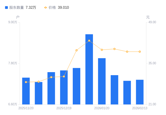 日期A股户数(户)流通A股户均持股数(股)户均持股市值(万元)2026-02-137322311217.9843.762026-02-107290011267.6843.942026-01-307456611015.9343.992026-01-207953110328.2340.922026-01-09865119494.9140.602025-12-317664910716.5742.292025-12-197595010815.2033.022025-12-107544110888.1732.982025-11-287254911322.2032.552025-11-207382711126.2031.84