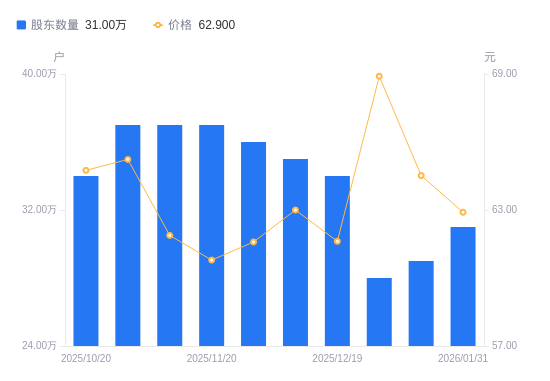 日期A股户数(户)流通A股户均持股数(股)户均持股市值(万元)2026-01-313100004731.7229.762026-01-202900005058.0432.632026-01-092800005238.6936.092025-12-193400004314.2126.582025-12-103500004190.9526.402025-11-283600004084.7025.162025-11-203700003974.3024.162025-11-103700003974.3024.592025-10-313700003974.3025.922025-10-203400004324.9728.00