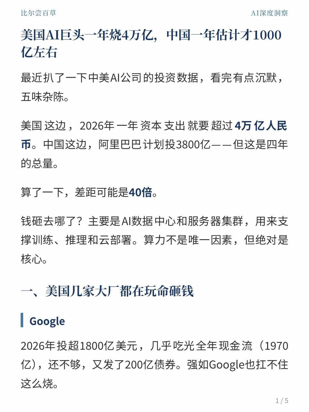 美国的科技巨头都在疯狂砸钱。从财务视角审视中美AI发展,美国的投入达到了中国的四十倍。 美国投入了如此巨额资金,其效果几乎都体现在股市上。 在AI尚未具备自我思考能力之前,它本质上仍是软件,由算力、数据和算法构成。算力最终会出现过剩,算法也可相互借鉴(抄袭),仅依靠这两者难以取胜,最终起决定性作用的还是数据。 而在数据方面,中国无疑占据优势。我们拥有悠久的历史文化,庞大的人口基数,每天都有各种奇思妙想为大数据提供养分,这是美国所欠缺的。 在中美AI领域的竞争中,在工业领域的场景应用方面,中国AI大幅领先美国,甚至在聊天、图片生成、视频生成等方面也已实现反超。 我觉得在中美AI之争中,中国更具优势。我们电力充足,数据储备更是稳居世界第一,还有坚实的工业基础。 例如美国长滩港LBCT码头,美国港口约80%的岸桥/场桥由中国振华重工提供,是自动化设备主力供应商。 美国所做的全是虚无缥缈的泡沫。我个人认为,不出3年,美国AI泡沫就会破裂,就像元宇宙、区块链等一样,换汤不换药! 届时,美国的硅谷 + 华尔街模式将会被击垮。