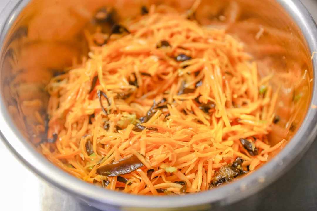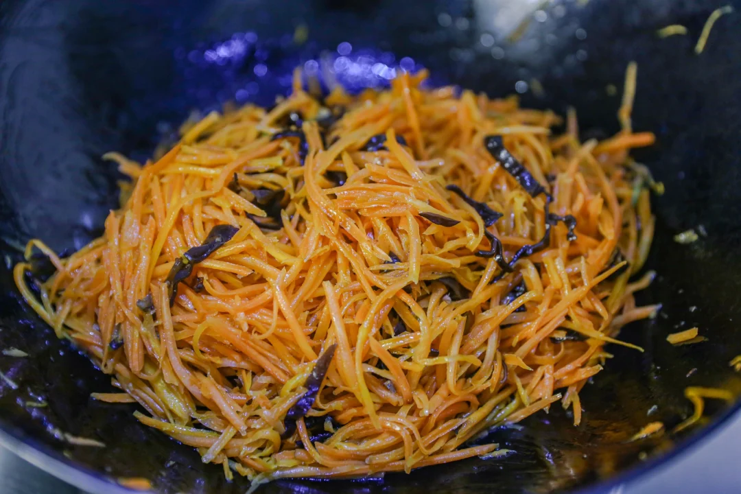 1.胡萝卜去皮后擦丝,干木耳大约10克放入凉水中提前浸泡2个小时,然后切成丝。