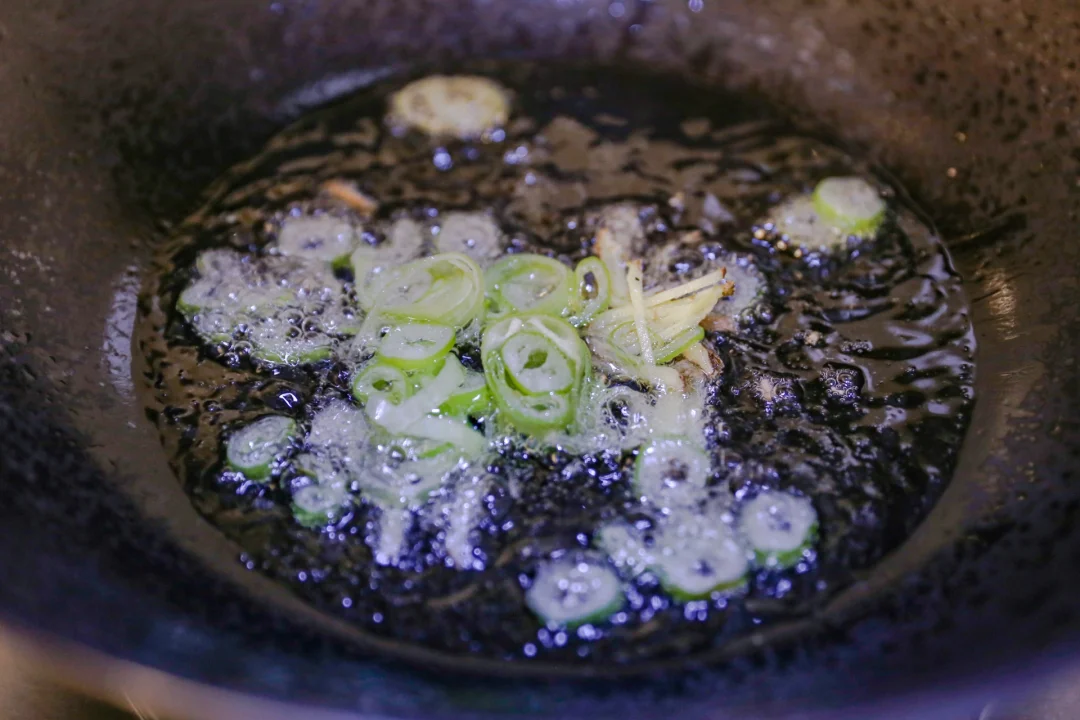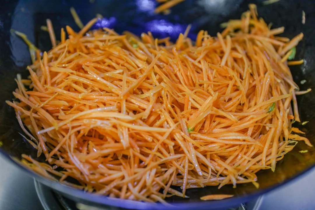 2.锅烧热,加入食用油,放入姜末和葱花(5克)炒香,加入胡萝卜丝炒出红油,放入木耳丝翻炒均匀。