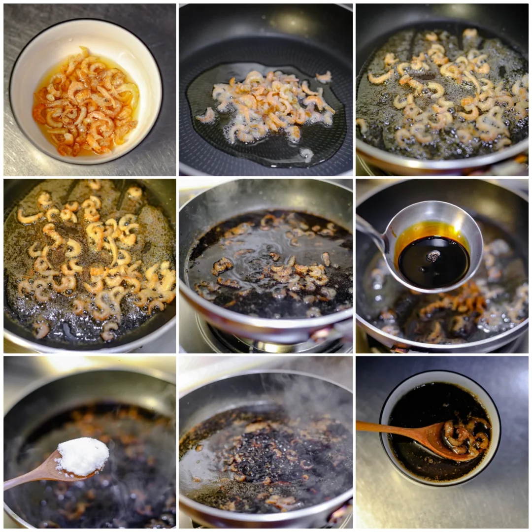 3.锅中倒入葱油,加入泡软的海米炒到金黄酥脆,放入酱油,清水,熬煮一小会儿之后加入生抽,白糖,食盐,鸡粉,再加入少许清水,熬到汤汁能挂到汤勺上,稍微黏稠就可以关火了。