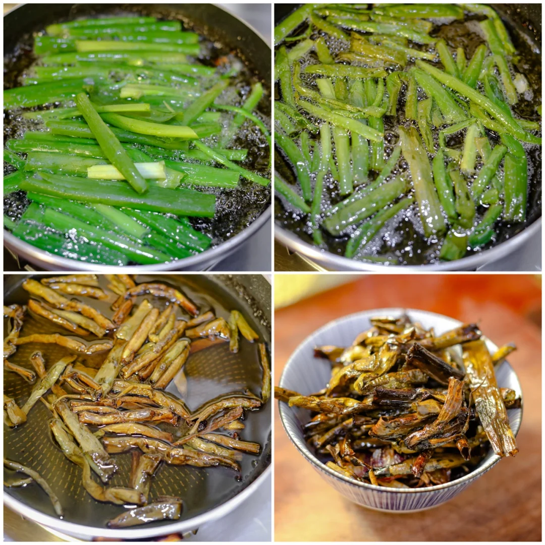 2.紫色的洋葱切成丝,姜切片。凉锅凉油放入,中小火慢炸,把洋葱和姜片里的水分全部炸出来,炸成洋葱变成金黄色的时候捞出来,然后放入小葱,炸到金黄偏微微发黑捞出来。