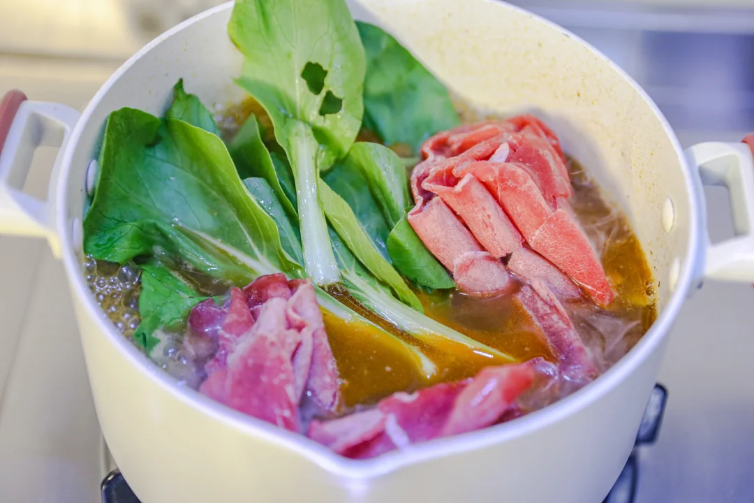 我的宅家美食日记 笔记灵感 麻辣肥牛面 最近一个周没有添置任何菜和肉,目的是为了再次冰箱断舍离。 做了一个麻辣肥牛面。 葱花蒜末炒香,加入火锅底料小半块,炒到融化。加入开水。放生抽、老抽、蚝油、白糖、食盐进行调味。 加入菇类和绿色蔬菜,加入面条和肥牛,煮熟捞出即可。 肥牛不是现成卷,是买了一大块牛上脑,然后让肉摊主给切成类似肥牛薄厚的片。这样的肉吃起来更放心~