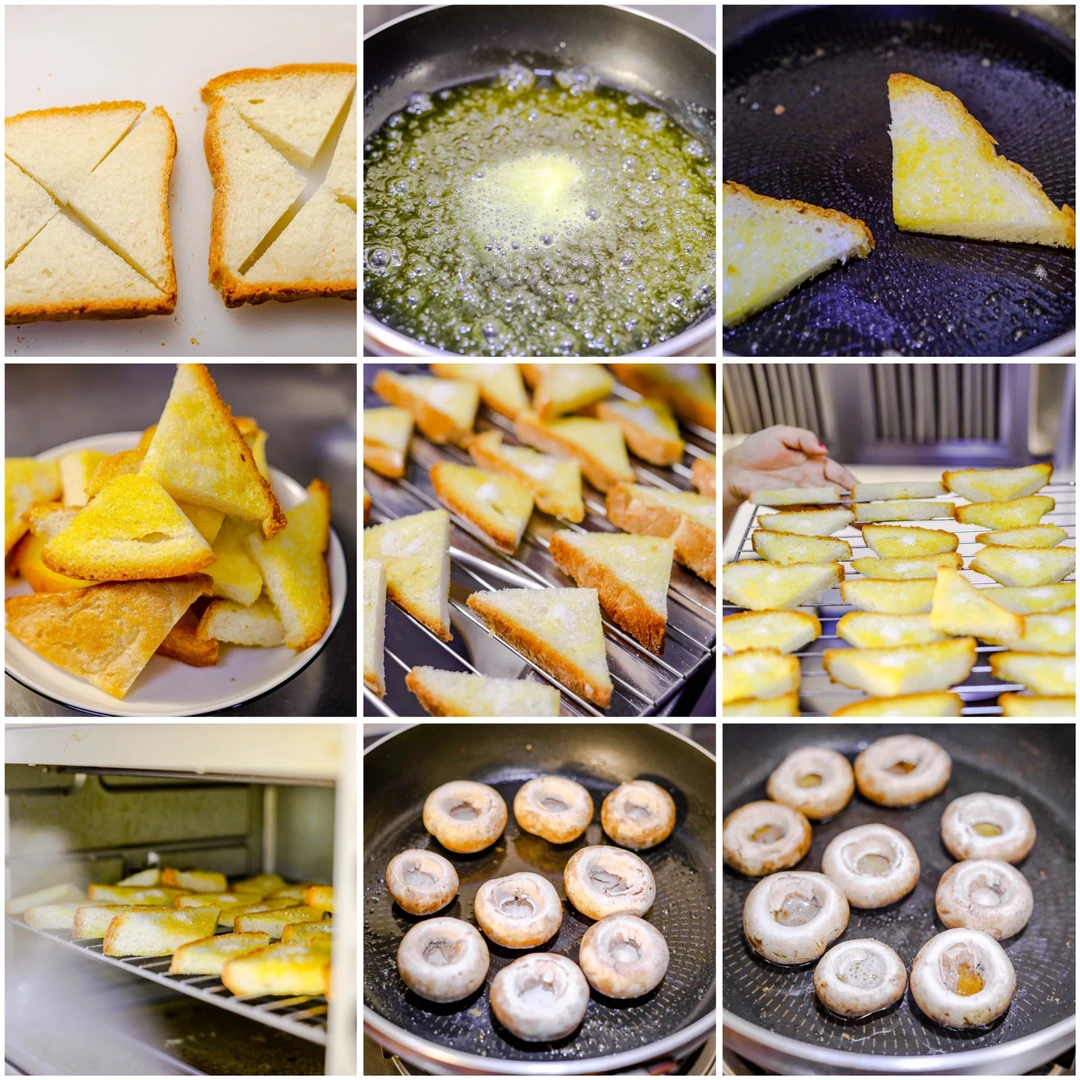1.吐司片对角切开,平底锅中加入适量的黄油,待平底锅稍微一加热足以把黄油融化,立马关火。把切好的吐司片放进去两面分别沾满黄油。