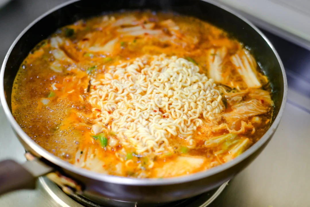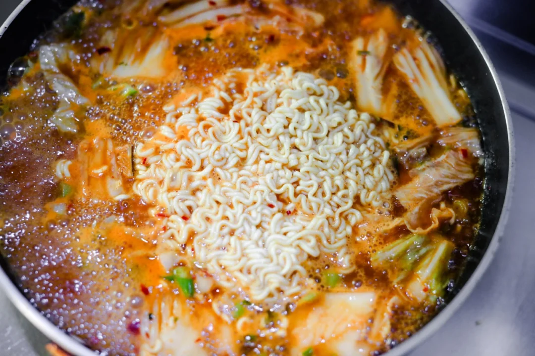 4.加入辣白菜,加入拉面,煮1-2分钟,关火。