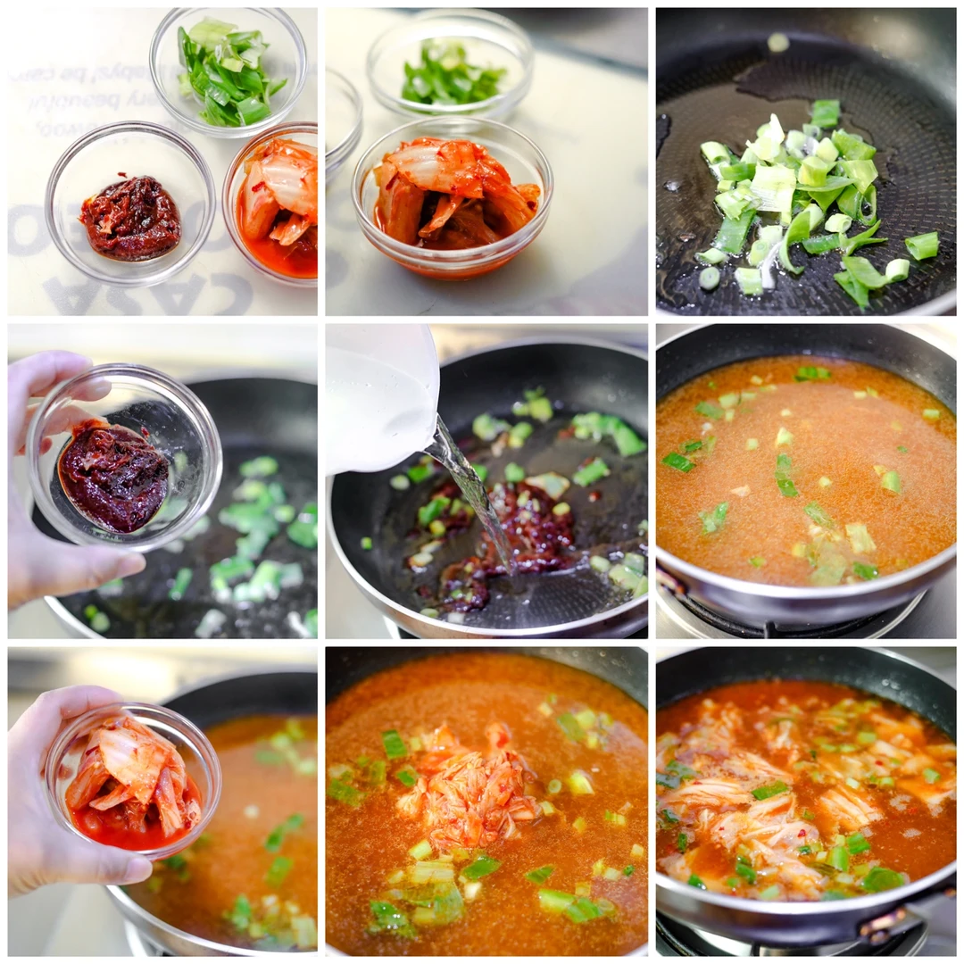 3.加入高汤或者清水,加入韩式辣酱,搅拌均匀,大火烧开。