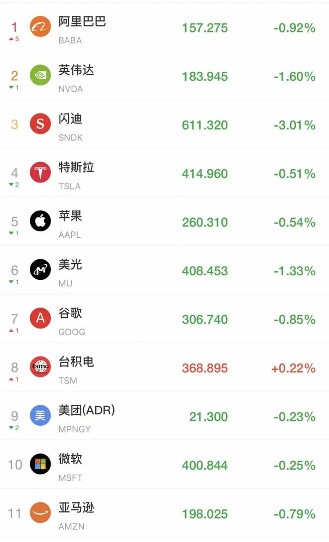 备受关注的科技“七巨头”齐跌,英伟达跌近2%,特斯拉、微软、谷歌、亚马逊、苹果、Meta跌幅均在1%以内。前两天大涨的存储概念也走低,闪迪跌超3%,美光跌超1%。