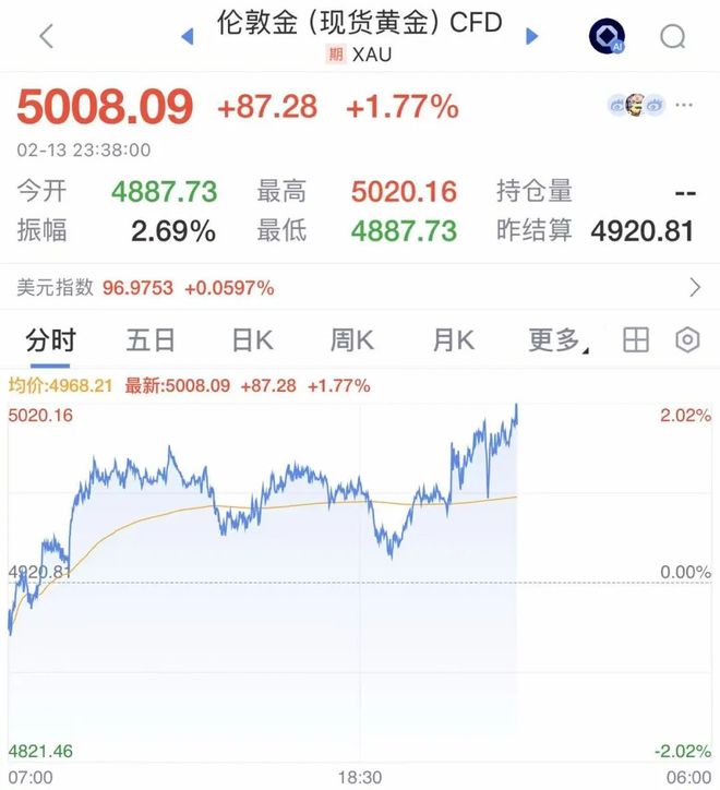 国际金价大涨,截至发稿,现货黄金重回5000美元,日内涨超近2%。