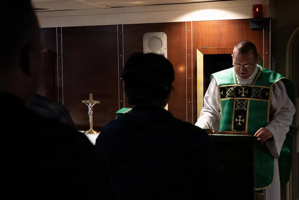 原来美军的航空母舰上还有教堂。 2026年1月25日,美国海军水手们在大西洋尼米兹级航空母舰乔治·H·W·布什号(CVN 77)上的礼拜堂参加宗教仪式。乔治·H·W·布什号正在航行中进行航母资格认证和例行作业。