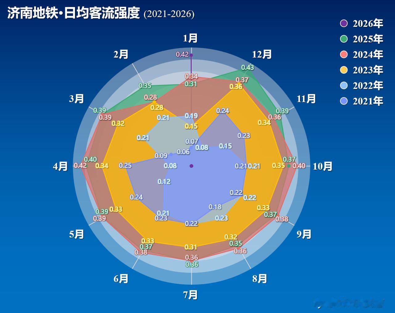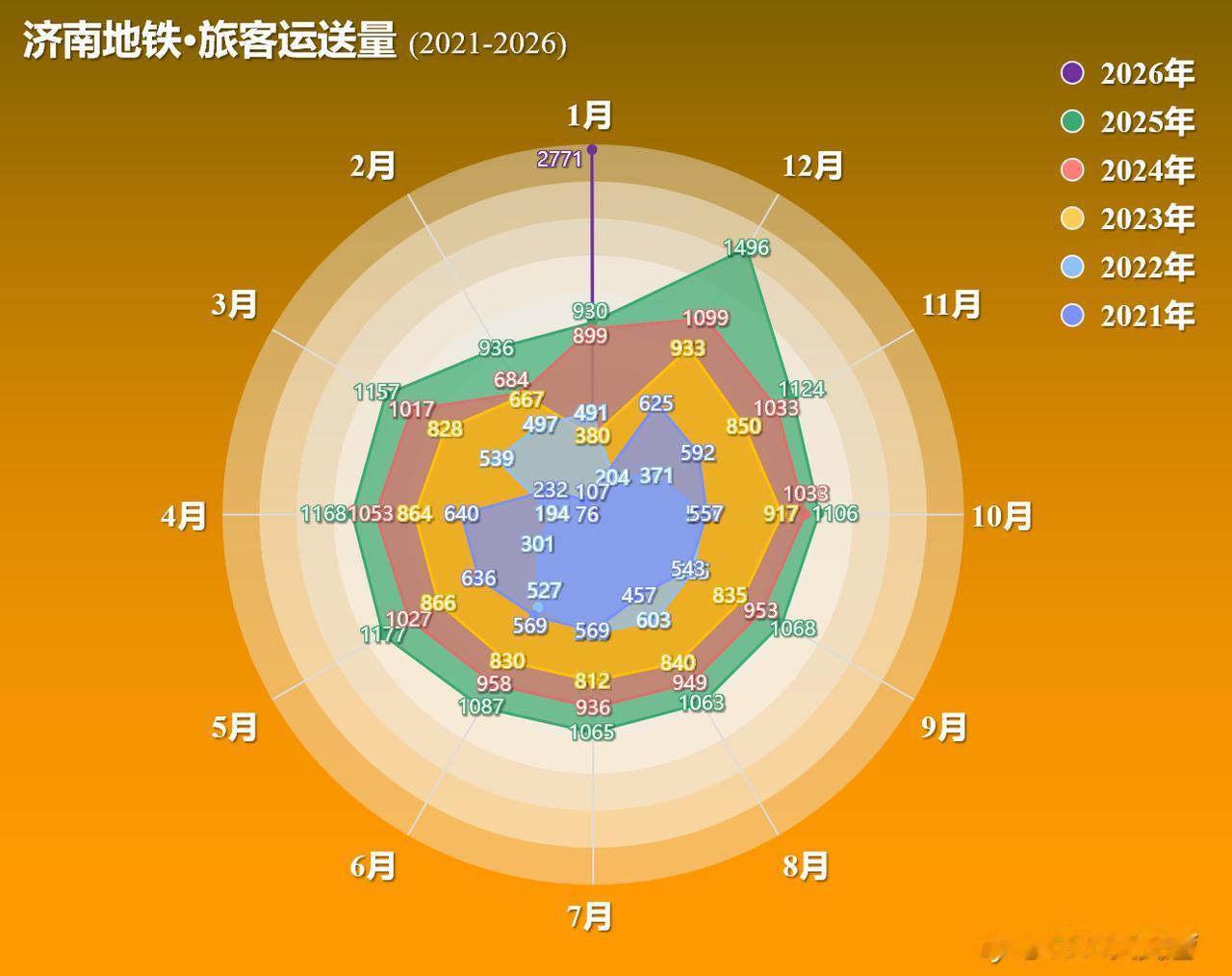 2026年1月济南地铁完成旅客运送量2770.6w人次,同比增长198.0%,环比2025年12月增长85.2%;日均旅客运输量89.37w人次,与12月27日-30日间的日客流量基本持平;1月客流强度0.416w人次每公里,同比增长34.39%,环比下降2.6%[无辜笑][无辜笑]。整体来说济南地铁1月份总客流量比我们上一期预测的2900w人次略低,但日均90w人次的客流量也算预料之中[奸笑][奸笑]。分线路来看的话,2/4两条线日均大概可以贡献20w+的客流量,从地铁集团的应对策略来看,本月3号线应该也有较大的客流提升,估计15w左右是有的,此外的1/6/8号线和济阳线应该都是10w以下的水平[大笑][大笑]。2月份赶上过年,预计济南地铁的全月客流在2200w人次左右;3月份济南地铁应该会创下客流新高,预计可以达到2900w以上,6号线和9号线开通前济南地铁的月客流峰值大概会出现在5月或者10月,突破3000w应该问题不大[狗头][狗头]