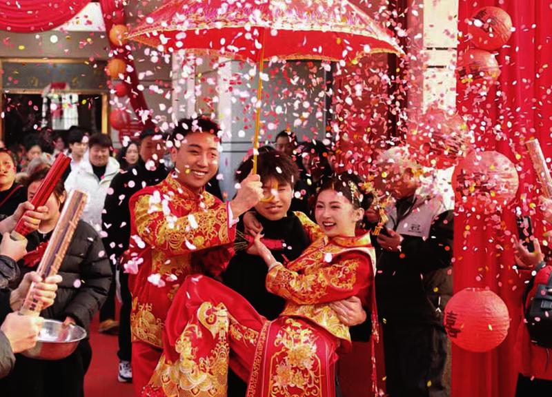 “彩礼薄来情意长,日子越过越兴旺!今个都来学学这对新人!”在新人李金国、邹子晴的“零彩礼”婚礼现场,婚礼“大总管”程文杰高声向众人说道。
