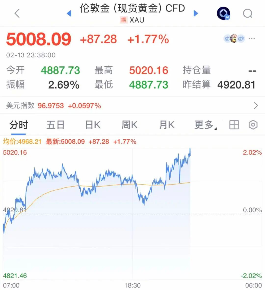 国际金价大涨,截至发稿,现货黄金重回5000美元,日内涨超近2%。