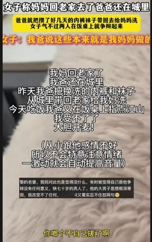 这种人能有老婆都是祖坟冒青烟了,整一个把老婆当做免费保姆。内裤袜子都能存着带回去给老婆洗,还强调这本来就是老婆应该做。 可怜之人必有可恨之处,关键老婆还觉得没什么,理所当然付出。女儿愤愤不平,为亲妈讨公道。 这种男人完全吃惯以前婚姻的红利,认为男人是天,女人就该围着自己转,洗衣做饭、生儿育女都是女人的分内之事。 他丝毫看不到老婆为家庭的付出,还觉得老婆做得远远不够。钱不见得存起来给老婆,但是袜子内裤却知道存起来给老婆。 其实这种男人还不少,说难听了,离开老婆,生活都不能自理。这时候,说男人至死是少年,听着就让人觉得恶心。 难以想象,这种男人的老婆都是怎么忍的,还能过一辈子。无法理解!