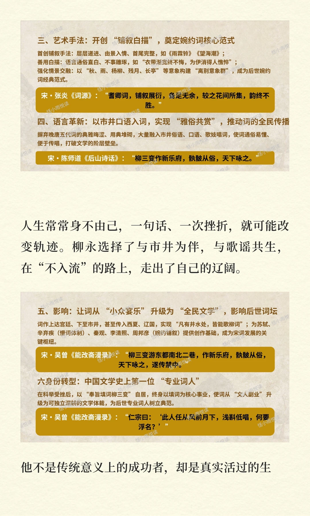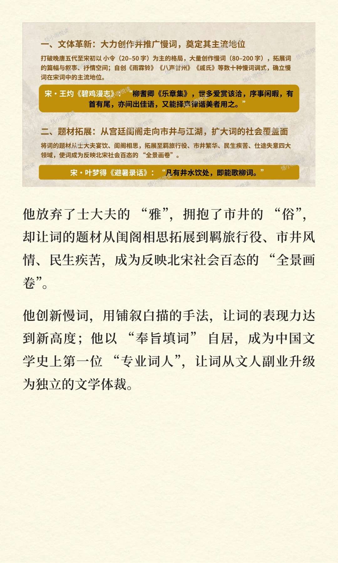 他以平等之心对待歌姬,创作了大量反映市井生活的词作,让词从士大夫的宴饮唱和走向街头巷尾,成为全民传唱的文学形式。
