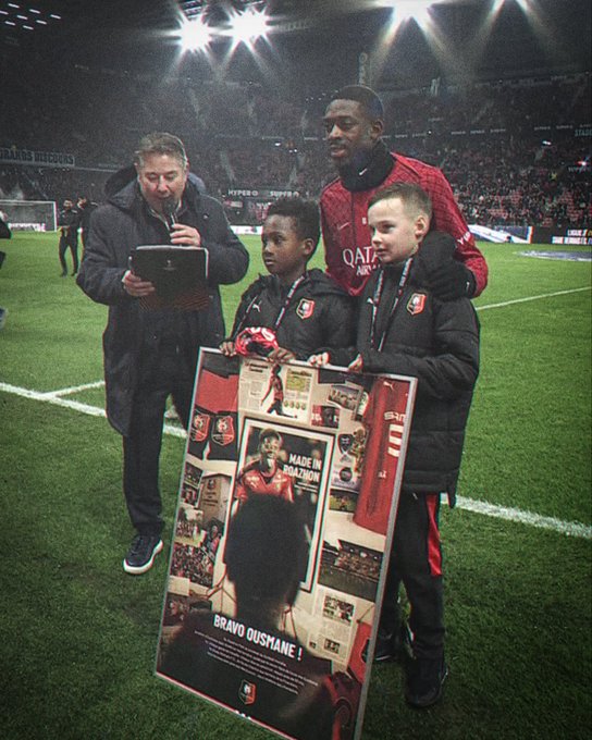 赛前,雷恩赠予登贝莱这位俱乐部优秀青训毕业生纪念海报。