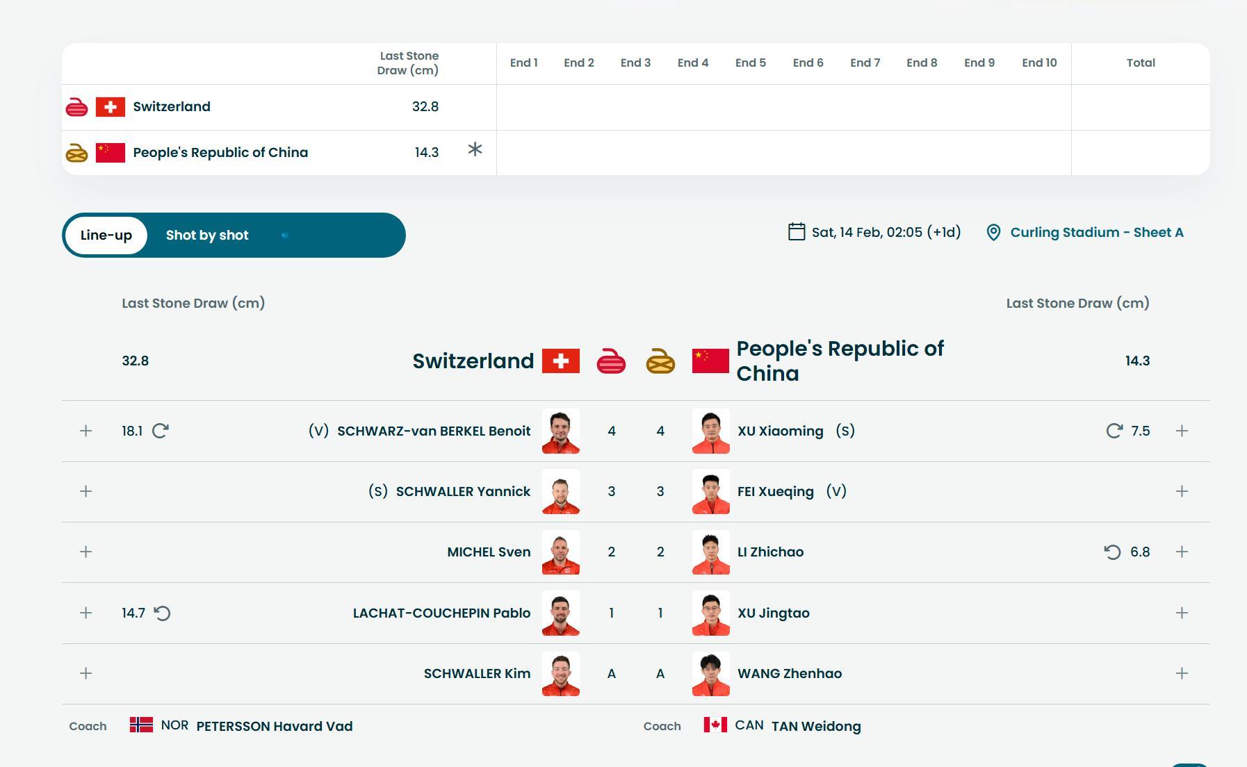 【奥运冰壶】男子循环赛LSD 瑞士32.8 cm-中国14.3cm中国冰壶队首次在米兰冬奥抢到开场后手权,加油打晓明7.5cm,智超6.8cm