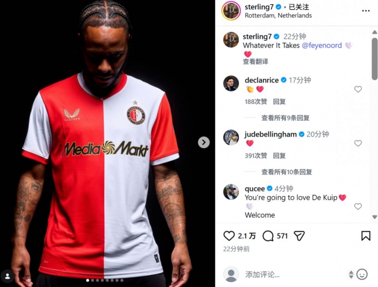 斯特林社媒晒身披费耶诺德战袍亮相照片:无论付出什么代价!