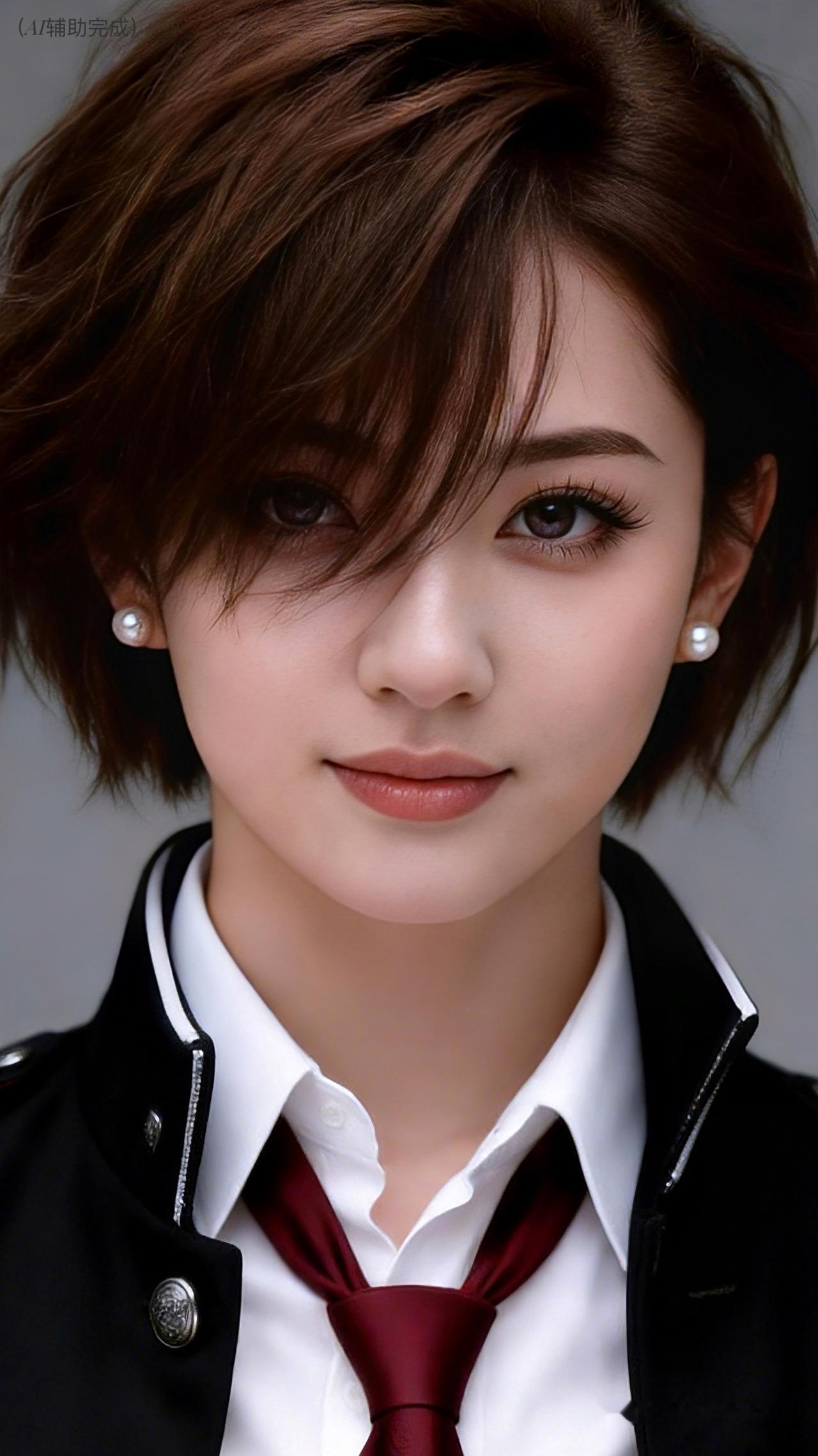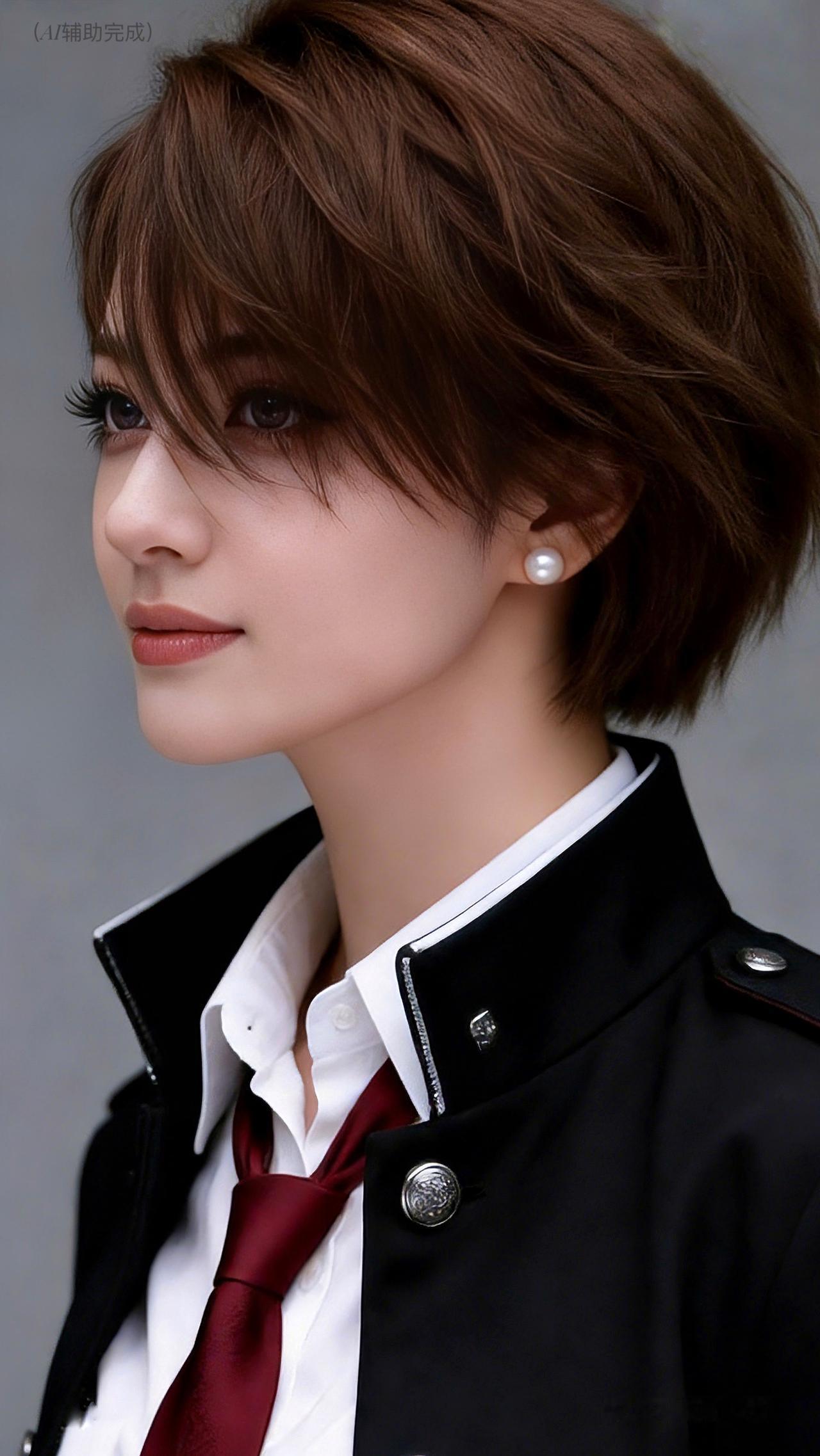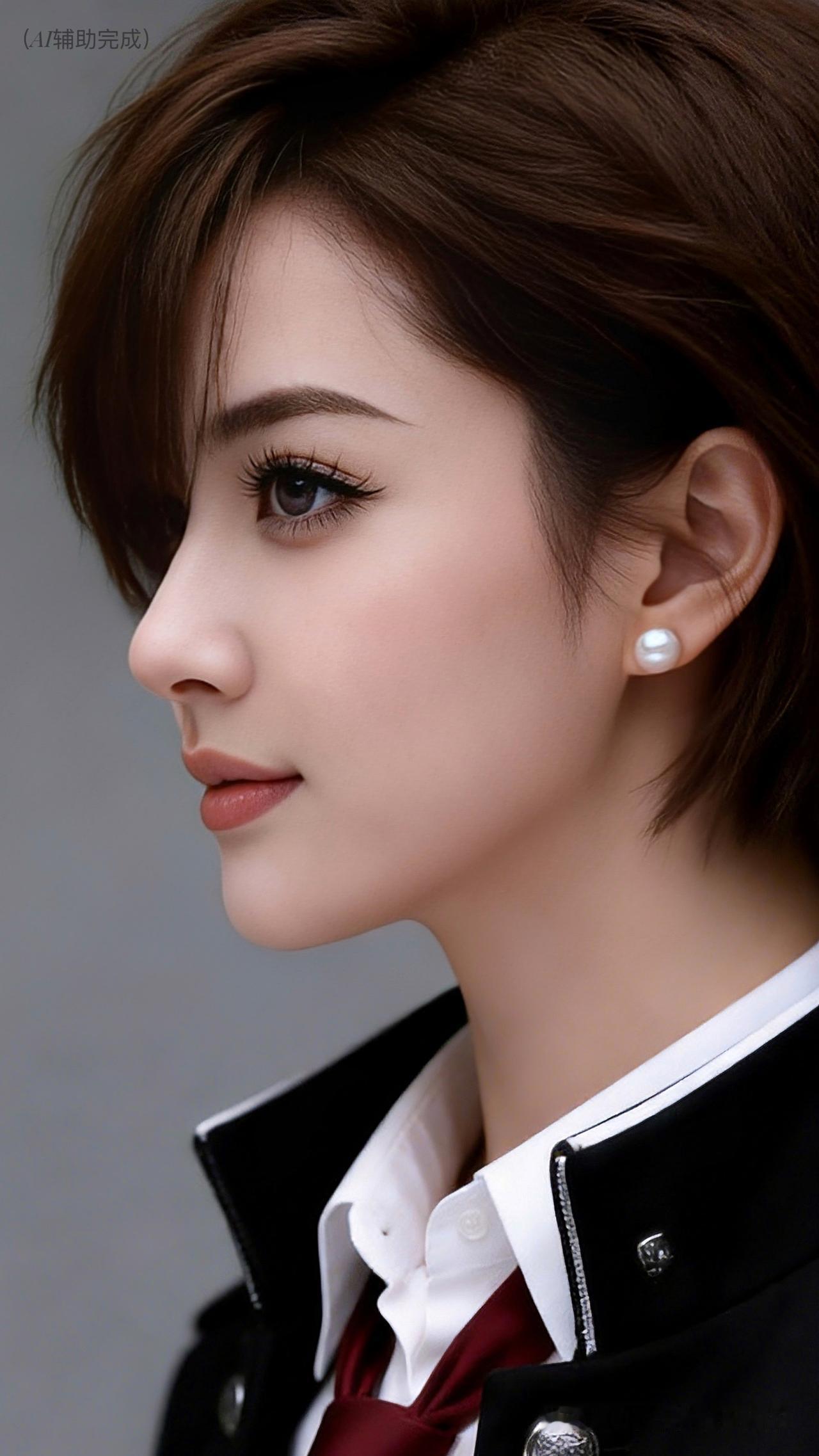 棕褐短发利落蓬松,白衬衫外搭黑外套系酒红领带,珍珠耳钉点睛。眉眼含情眸亮如星,唇色温润显从容。灰调虚化衬静谧,优雅知性干练漫帧间,这帧美人一眼沦陷!