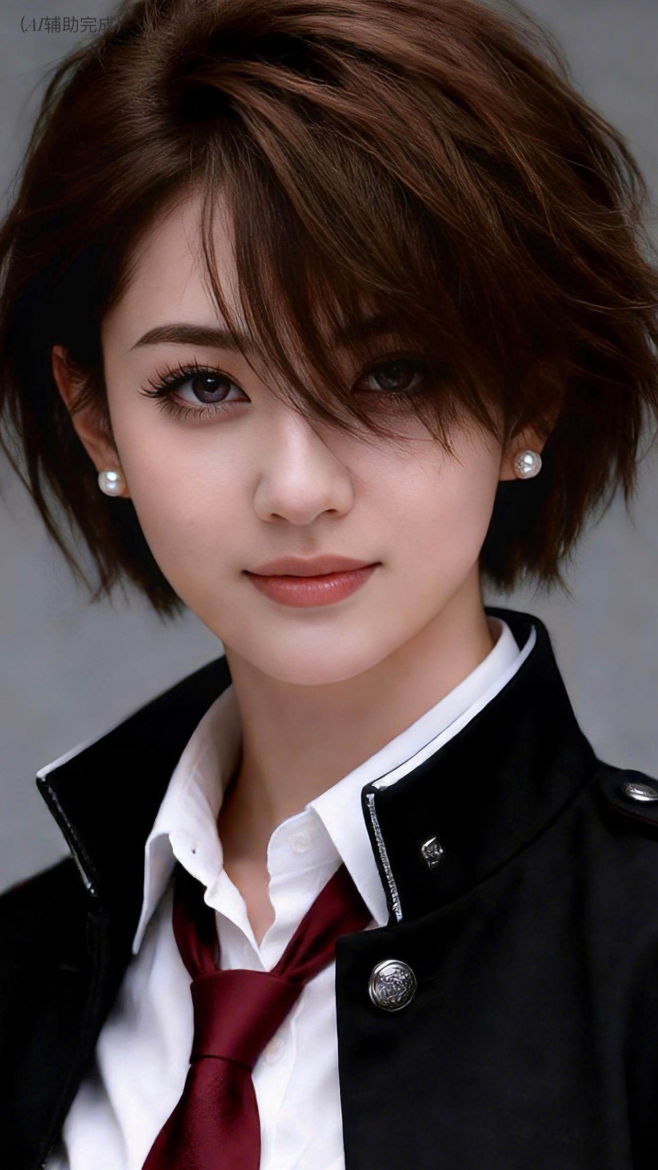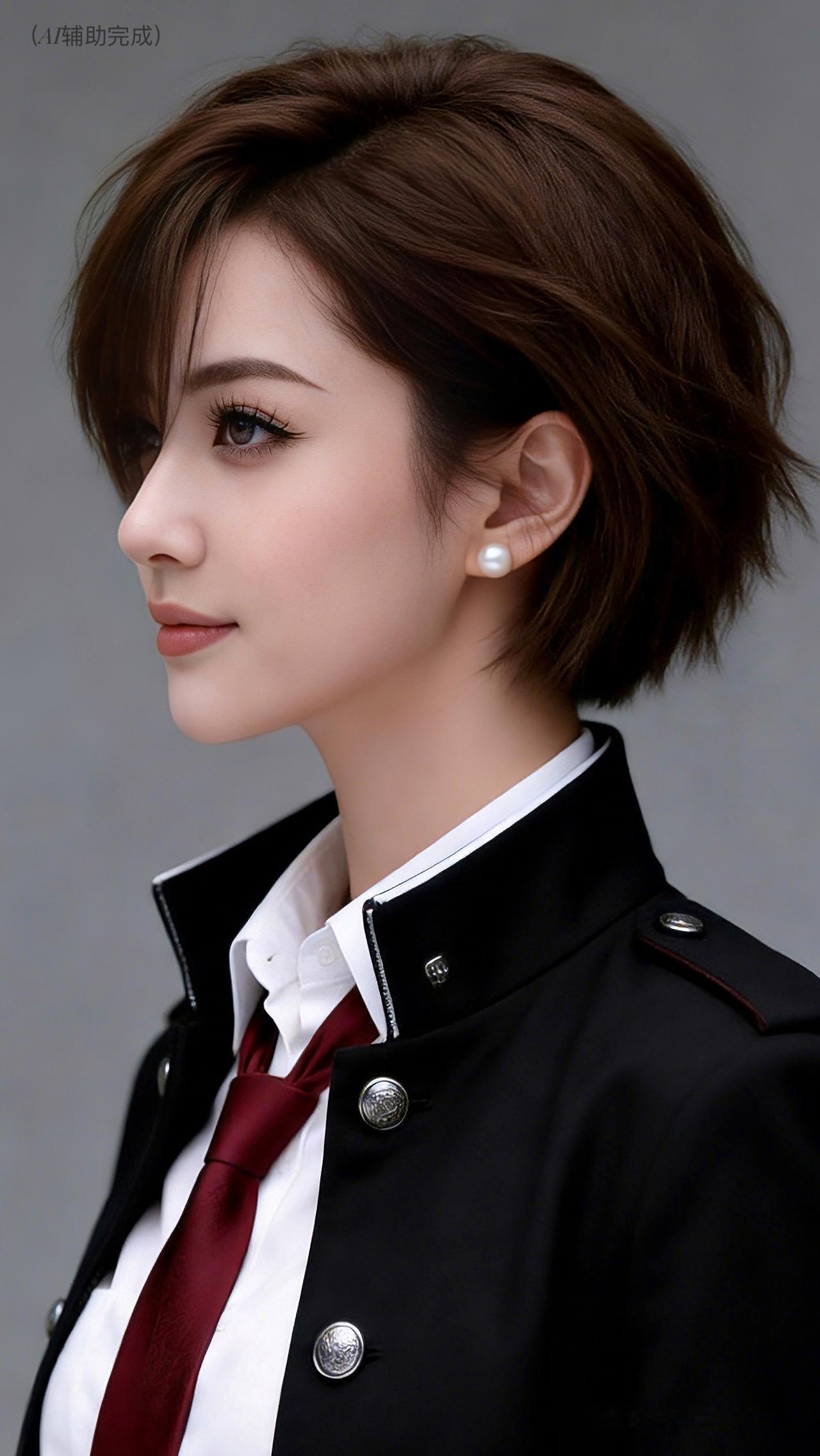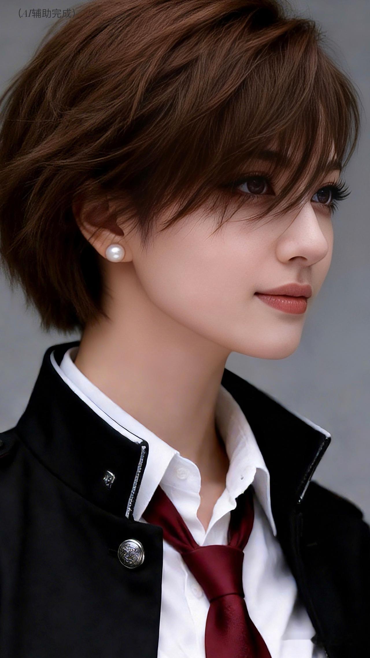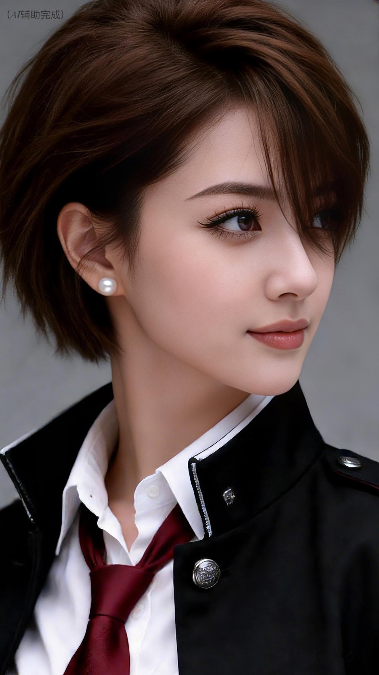 棕褐短发利落蓬松,白衬衫外搭黑外套系酒红领带,珍珠耳钉点睛。眉眼含情眸亮如星,唇色温润显从容。灰调虚化衬静谧,优雅知性干练漫帧间,这帧美人一眼沦陷!