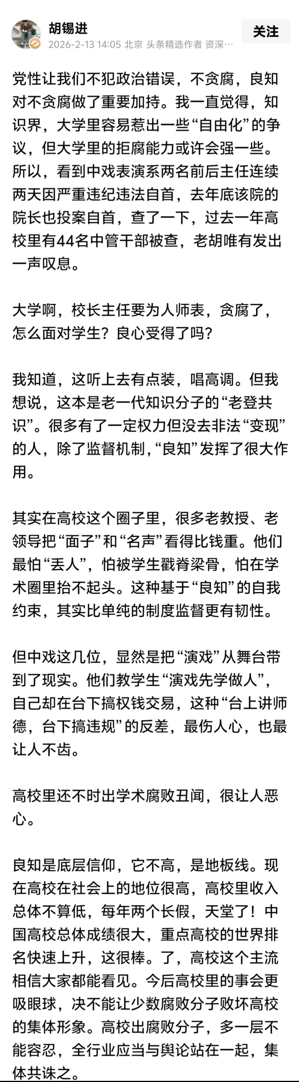 作为一介蚁民,平时偶尔在网上怼一怼胡锡进这样有身份的人物,以逗乐子,兼鸣不平。今天,看了老胡议论高校领导腐败的帖子,却很有同感。 老胡有一句话说得很在理∶“这种基于‘良知’的自我约束,其实比单纯的制度监督更有韧性”。 历史证明,即便法令制度多如牛毛,规定的事项多么事无巨细,都不能彻底杜绝官吏腐败。历史上所有清官的存在,除了制度作用,无不归因于其个人政治信仰和慎独式的道德自律。 当所谓精英群体成为精致的利己主义者,唯利是图、一切向钱看便大行其道,无坚不摧。这时,信仰崩塌、道德沦丧日趋严重和泛化。而信仰和道德的淡化催生腐败,腐败反过来又加剧信仰和道德的衰减。如此两相促进,腐败就愈演愈烈,无孔不入。于是,塌方式腐败出现了,连高校这样本来对信仰和道德高度自信自守的象牙塔也不清净了。 老胡所说“党性让我们不犯政治错误,不贪腐,良知对不贪腐做了重要加持”,也很对。但问题的关键在于,对某些人而言,信仰和道德已经双双缺席了!