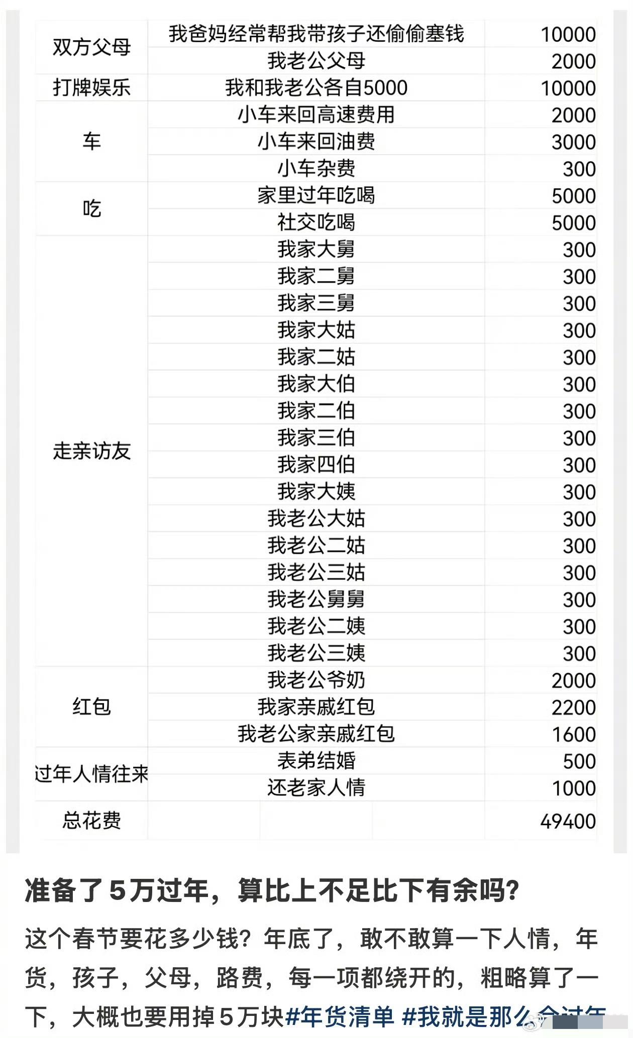 过年真花钱,我算算成本: 1、开车几百上千公里或坐高铁回去1500元。 2、给父母1000元,一年没回家了。 3、给丈母娘500元,虽然已经和老婆离婚了,毕竟她还是孩子的姥姥。 4、给姐姐两个孩子一人500元,得1000元。 5、买过年物品,鸡鱼菜肉等3000元。 6、走亲戚买礼物3000元。 7、亲戚聚餐1000元。 8、初六回去1500元。 过一个春节,7天,最少需要12500元。 春节假期,不少人辛苦一年就盼着回家歇歇。可仔细一算,回老家的开销可不少,来回车票、人情往来、吃吃喝喝,一趟下来钱包瘪了,人也累得够呛。其实,不回老家,就地过年反而更轻松。在工作地城市,喝个咖啡、逛逛街、吃顿好的,花不了几个钱,住的地方也不用额外掏钱。和回老家比起来,这哪叫花钱啊?根本就是享受! 回老家就像当“散财童子”,东奔西跑,钱花了不少,人还累得不行。现在我选择就地过年,怎么舒服怎么来,一切以自己的感受出发。毕竟,辛苦一年,就该好好犒劳自己,何必为了“传统”而折腾呢?