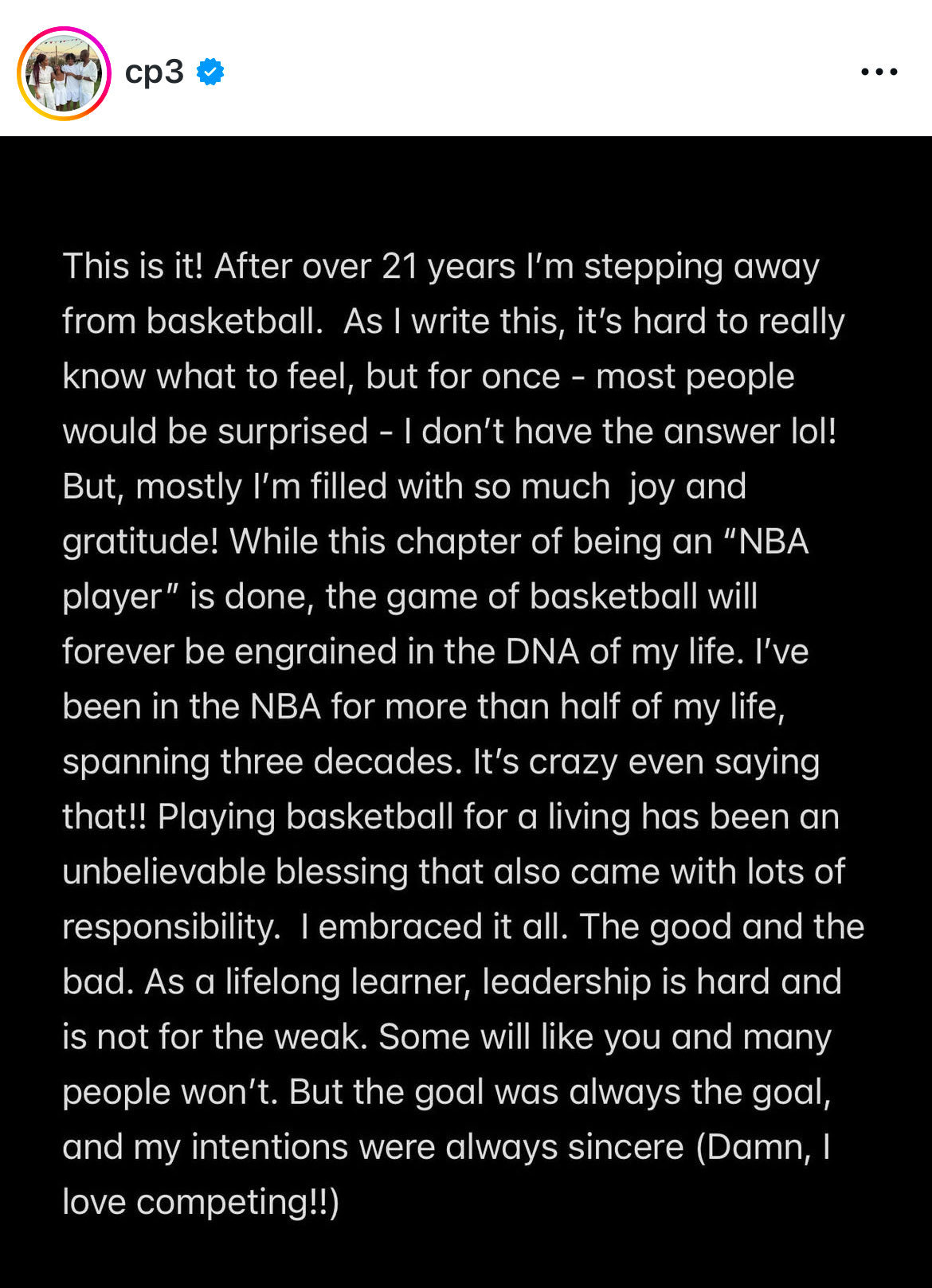 “是时候了!在21年多之后,我将离开篮球赛场。写下这些话时,我甚至不知道该如何形容自己的心情,但这一次——也许很多人会惊讶——我真的没有答案(笑)。不过更多的,是满满的喜悦与感恩。...”
