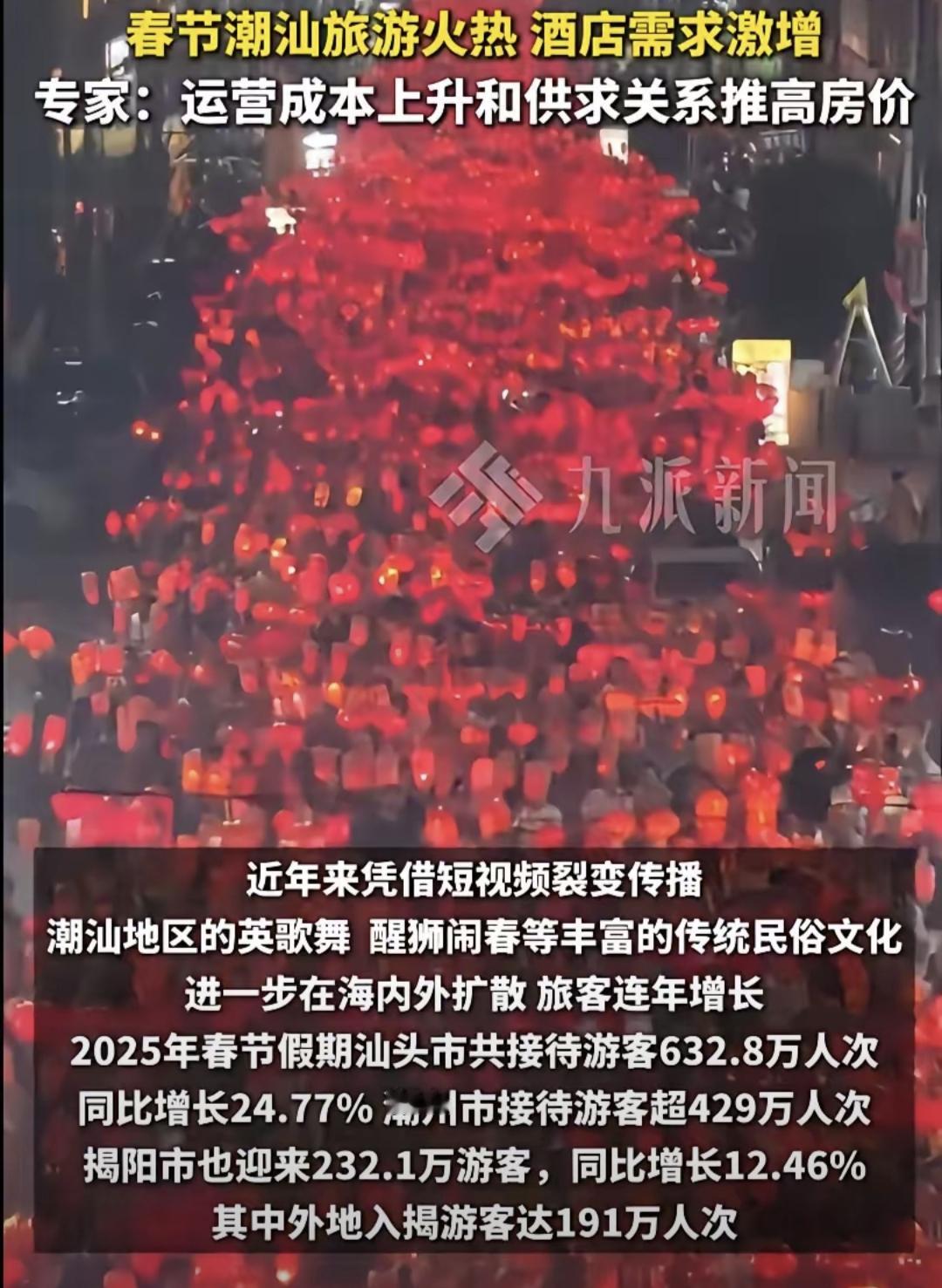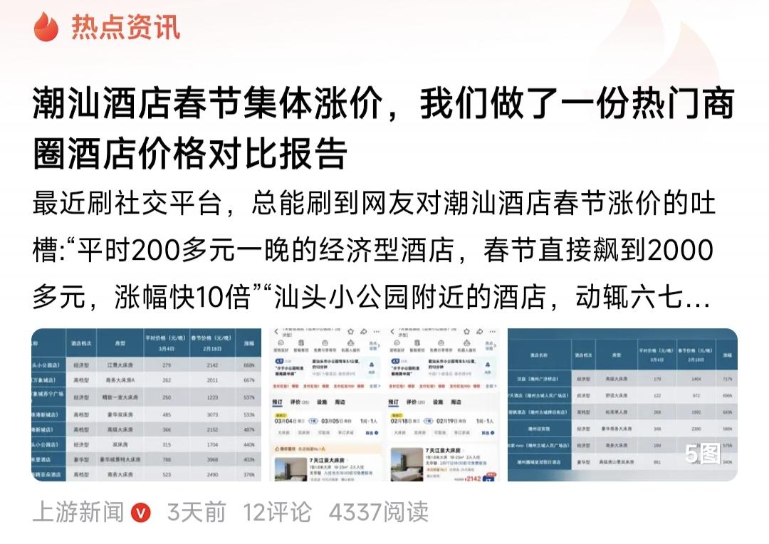潮汕一些酒店疯狂涨价,其实还是反映了我们的一些商家喜欢做一锤子买卖,能赚的时候就疯狂的赚,不管后续效应,不管长远。所以我们真的很难出现百年老店,因为诚信这两个字,真正做到很难。 当然,有网友说,酒店价格应该由市场来调节,觉得贵,你可以不去。 这话真的说到点子上了。理性分析,这两年,由于短视频带动潮汕以英歌舞为代表的文旅游的火爆,这绝对是千载难逢的发展旅游的契机,正常的或者好的做法是让这种契机延续,给每个游客带来好的体验,包括酒店和饭店的价格体验。也就是说,不要鼠目寸光,不要在这一波游客上赚够了钱,而下一波游客可能就不会来了,表面上看是这一波游客受到损失你赚到了钱,长远看是整个潮汕的旅游受到损失,游客会望而却步,而旅游从业者包括饭店,酒店受到的损失更惨重。这样的例子是有的,大家可以查一查。 所以酒店饭店不应该抱团涨价,而是要抱团承诺诚信经营。春节期间你涨一点是可以的,但你几倍几倍的涨,几百元涨到几千元,这是不是杀鸡取卵断了自己的后路。 好在潮汕相关部门已经干预酒店疯狂涨价,很多酒店价格已经回调了。这虽然不是最好的方式,但应该有比较好的结果。 我去过潮汕地区很多次,真的很喜欢那些地方,有自然风光,有民族风情,值得一游。春节