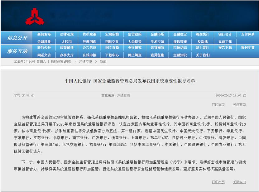 2月13日下午,人民银行公布了2025年度我国系统重要性银行。为构建覆盖全面的宏观审慎管理体系,强化系统重要性金融机构监管,根据《系统重要性银行评估办法》,近期中国人民银行、国家金融监督管理总局开展了2025年度我国系统重要性银行评估,认定21家国内系统重要性银行,其中:国有商业银行6家,股份制商业银行10家(我国有12家股份制银行,其中2家未入选),城市商业银行5家。这21家国内系统重要性银行都是个人养老金的资金账户银行,也是个人养老金储蓄产品的发行银行。