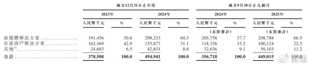 再惠2025年前9个月来自新媒体解决方案收入为3亿元,占比为66.5%;来自在线商户解决方案收入为1亿元,占比为22.3%。