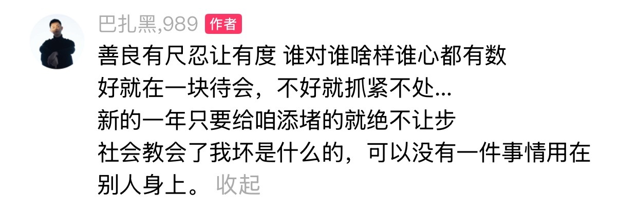 巴扎黑发文:善良有尺忍让有度 谁对谁啥样谁心都有数,好就在一块待会,不好就抓紧不处…新的一年只要给咱添堵的就绝不让步,社会教会了我坏是什么的,可以没有一件事情用在别人身上。