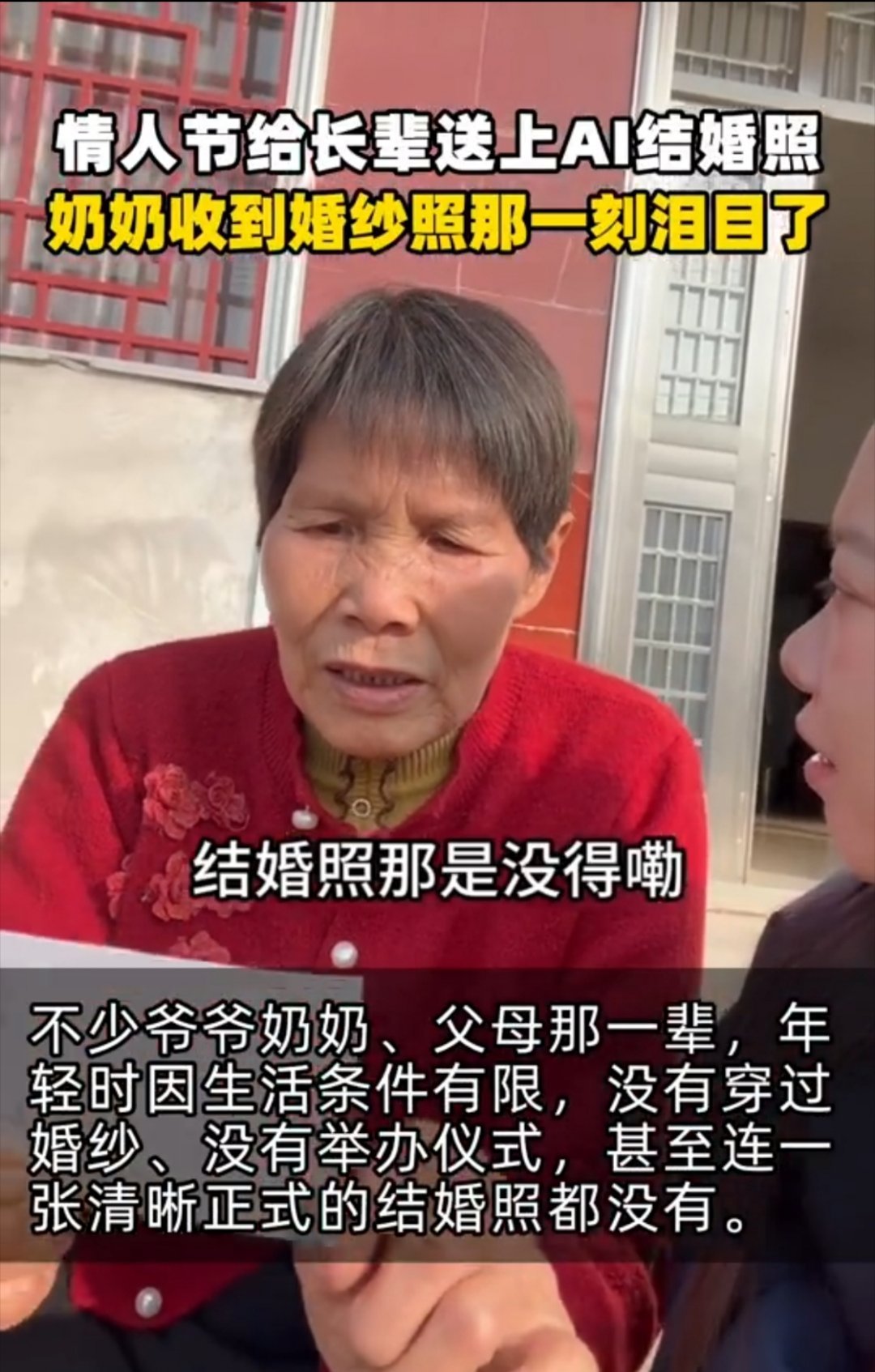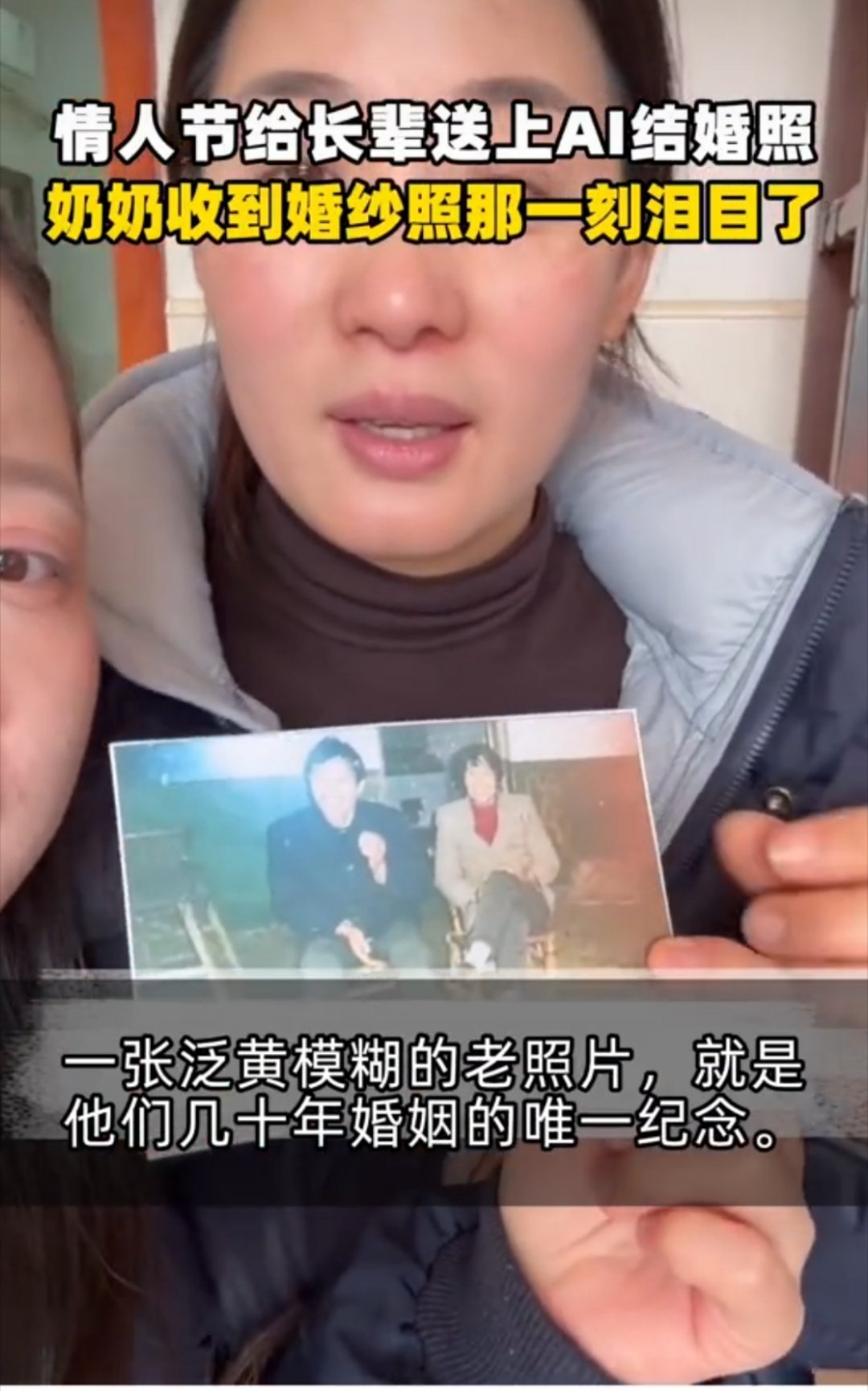 那个年代的爱情,大多没留下什么影像。爷爷奶奶那张唯一的合照,早就模糊得看不清眉眼了。孙子悄悄用AI修复、上色,还“补拍”了张婚纱照。递过去时,奶奶看了很久,认出了自己,也认出了记忆里爷爷年轻时的样子,眼眶一下子就红了。情人节给长辈送上AI结婚照奶奶收到婚纱照那一刻泪目了或许对他们来说,遗憾的不是当年没穿婚纱,而是这辈子最珍贵的模样,连张清楚的照片都没留下。谢谢这份用心,替时光还了这份愿。
