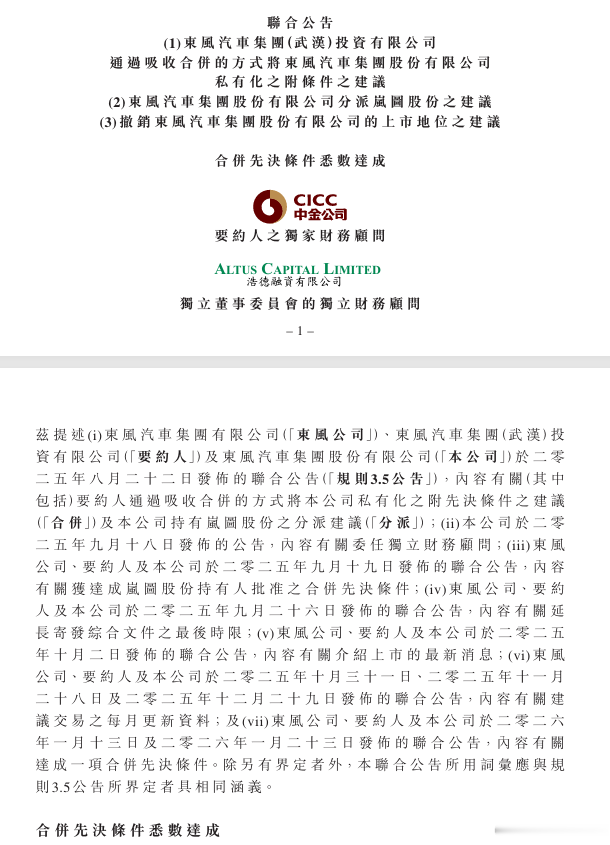 猫头鹰车志(ID:owlauto)讯,据东风集团股份2月12日早间在港交所发布的公告,关于东风汽车集团(武汉)投资有限公司通过吸收合并方式将东风集团股份私有化、该公司分派岚图股份及终止上市地位的相关建议,于联合公告当日,合并先决条件已获悉数达成,标志着东风集团股份私有化进程扫清关键障碍,进入最后执行阶段。