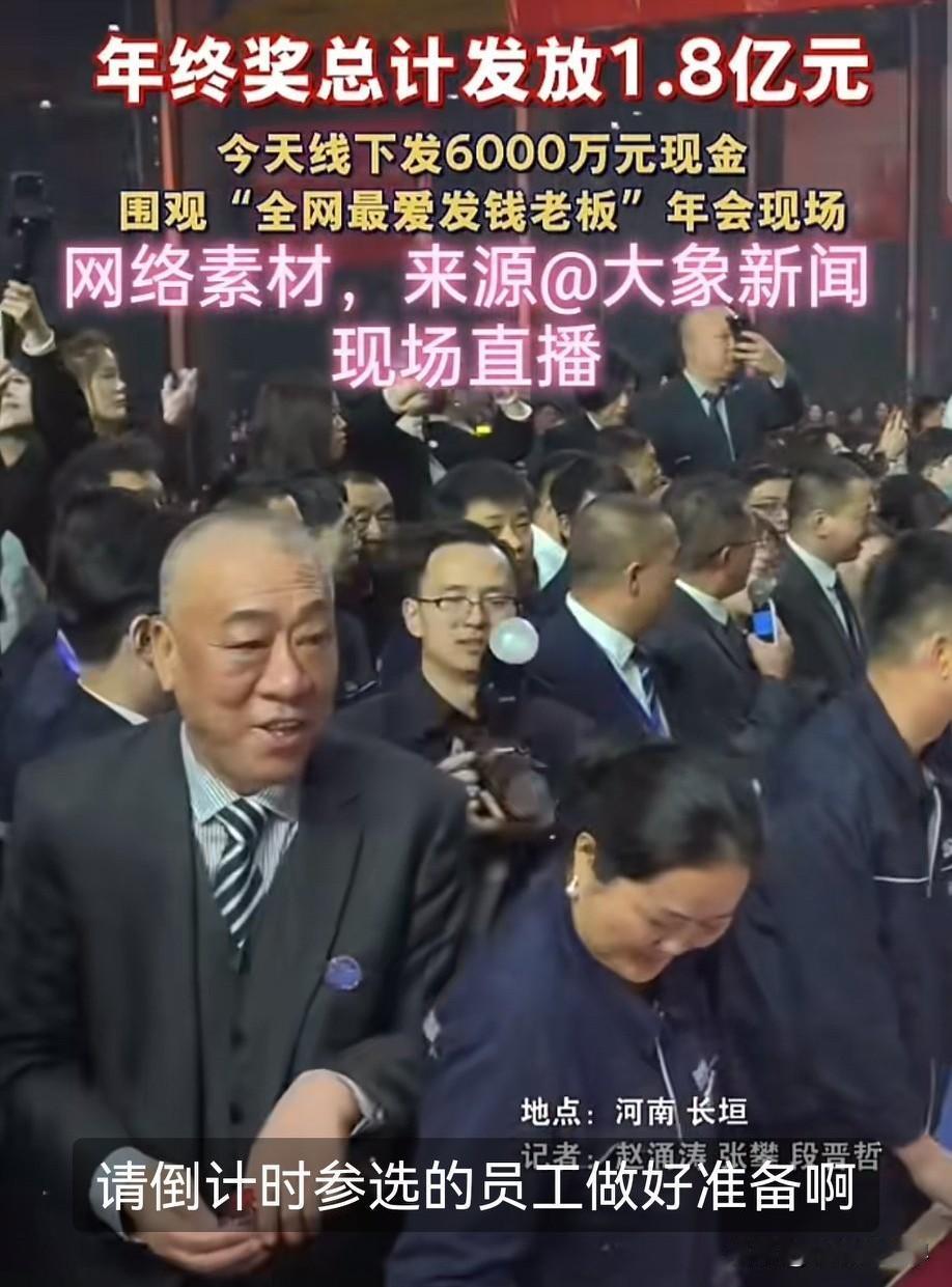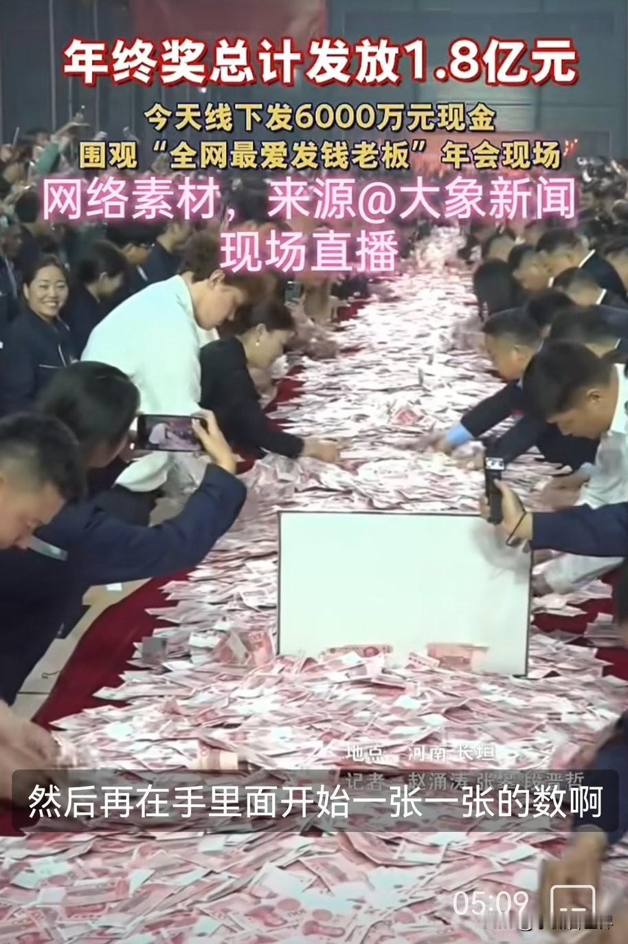 天呐!这么多百元大钞,只要你不停数,数到多少都是谁的!这也太刺激了吧! 大清早就刷到河南矿山集团发奖金的小视频。居然,他们公司拿出1.8亿元作为年终奖呢! 而就在昨天发放现场,金额也达到惊人的6000万!只见现场,百元大钞在桌上铺满一长溜。 一声令下,员工们纷纷点起了钞票,规定时间内,谁点的就是谁的。 不过也有个苛刻条件,就是你数到多少钱报出来的数字,应和实际金额符合,如果不符合,就得以一罚十啊! 据说前几年这家公司就这么操作的,不过点钞时间只有三分钟,今年有了调整,最长的可以到15分钟。 15分钟呐!想想就兴奋,赶紧点,赶紧点,如果运气好,说不定十几万就来了! 不过,我还是认为点错就要以一罚十的规定太不好了!那难道点错的人非但拿不到奖金还要往外掏钱么? 哈哈!估计这个厂的员工每天回到家,闲下来都在练数钱的快准速度,做好迎战第二年多拿奖金的准备。 不得不说,河南矿山集团这波操作太让人刮目相看了。让太多人羡慕了!毕竟这么明目张胆送奖金,谁会不羡慕开心呢?