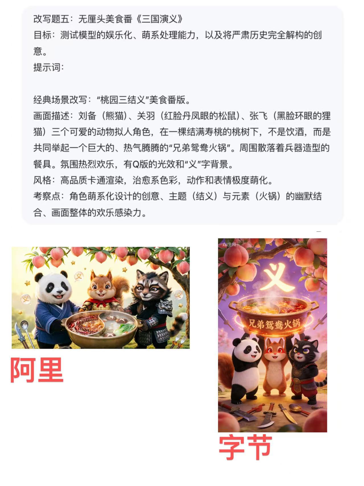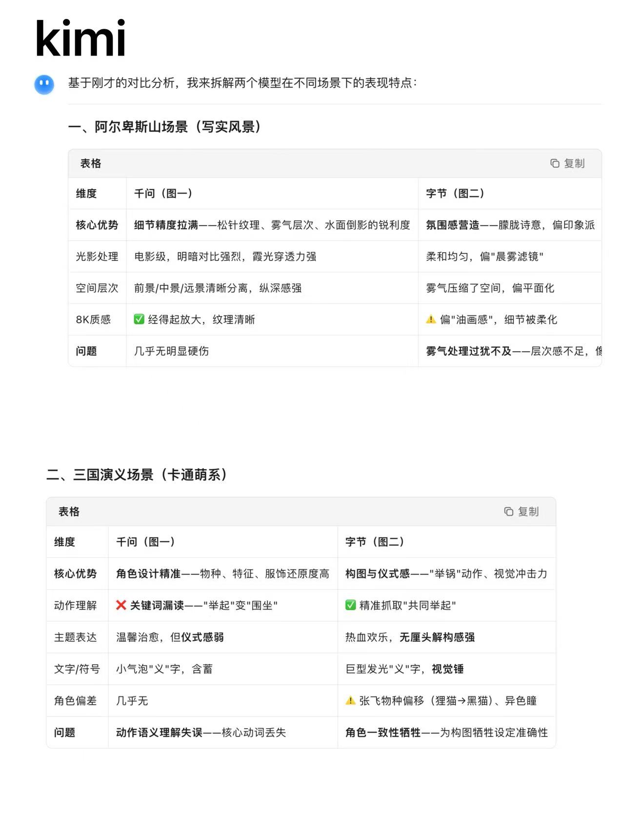 kimi认为,阿尔卑斯山场景(写实风景)中,qwen-image-2.0的细节精度拉满、纹理清晰,而seedream5.0更重氛围感营造,朦胧诗意,偏印象派,但偏“油画感”,细节被柔化。而三国演义场景(卡通萌系)中,kimi认为,qwen-image-2.0漏读关键词“举起”而更像“围坐”,seedream5.0更体现出了热血欢乐氛围,无厘头解构感强。最终,kimi给出的判词是:“qwen-image-2.0像严谨的工程师,seedream5.0像懂流量的设计师——没有绝对优劣,只有场景适配。”