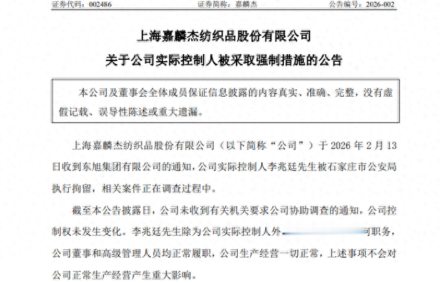 2月13日晚间,嘉麟杰(002486.SZ)公告称,公司于当天收到东旭集团有限公司的通知,公司实际控制人李兆廷被石家庄市公安局执行拘留,相关案件正在调查过程中。截至本公告披露日,公司未收到有关机关要求公司协助调查的通知,公司控制权未发生变化。李兆廷除为公司实际控制人外,未在公司担任任何职务,公司董事和高级管理人员均正常履职,公司生产经营一切正常,上述事项不会对公司正常生产经营产生重大影响。