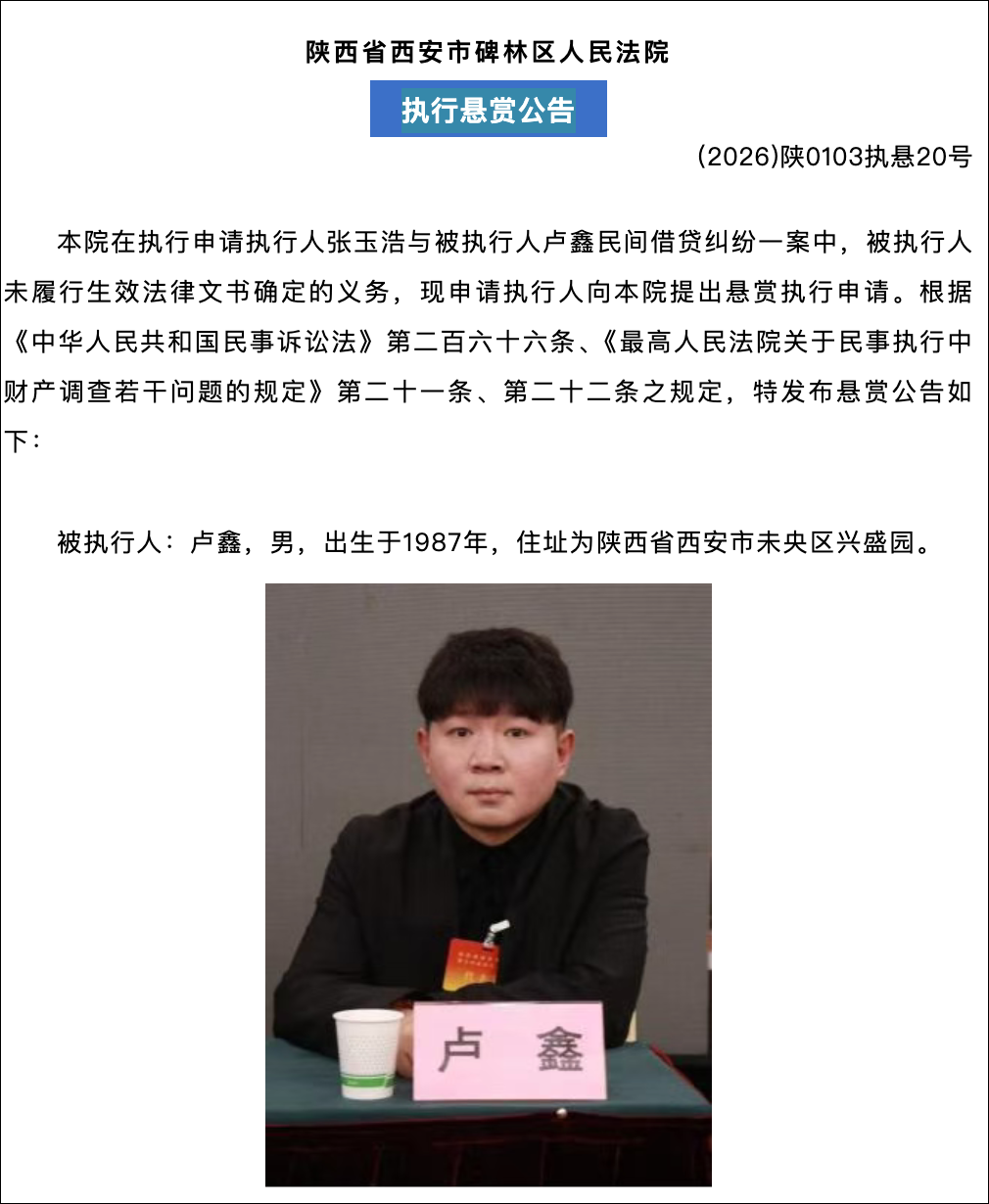 2月11日17时54分,西安市碑林区人民法院微信公号发布执行悬赏公告(2026年第5期),将被执行人卢鑫的照片头像、身份证号码前14位、住址等信息公布,该案执行案号为:(2025)陕0103执5553号,执行标的为20万元。