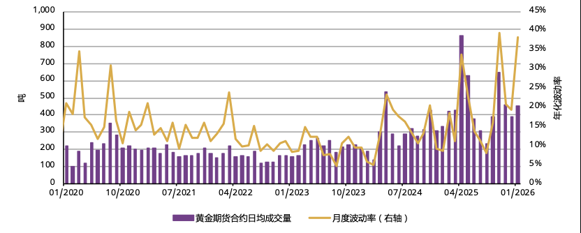 2026年1月,上海期货交易所黄金期货日均交易量达到456吨,市场活跃度明显提升。受金价波动性加剧及价格强劲上涨推动,投资者关注度持续升高,带动期货交易量环比增长17%。