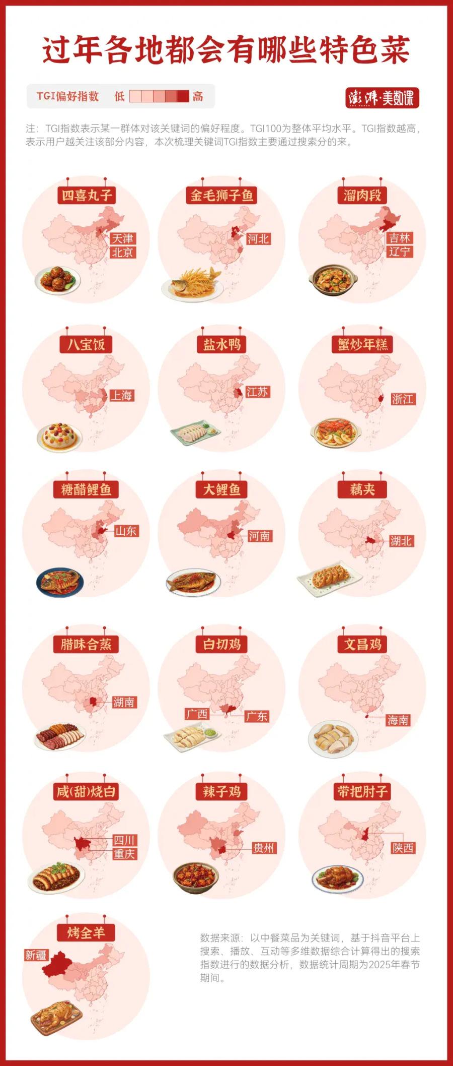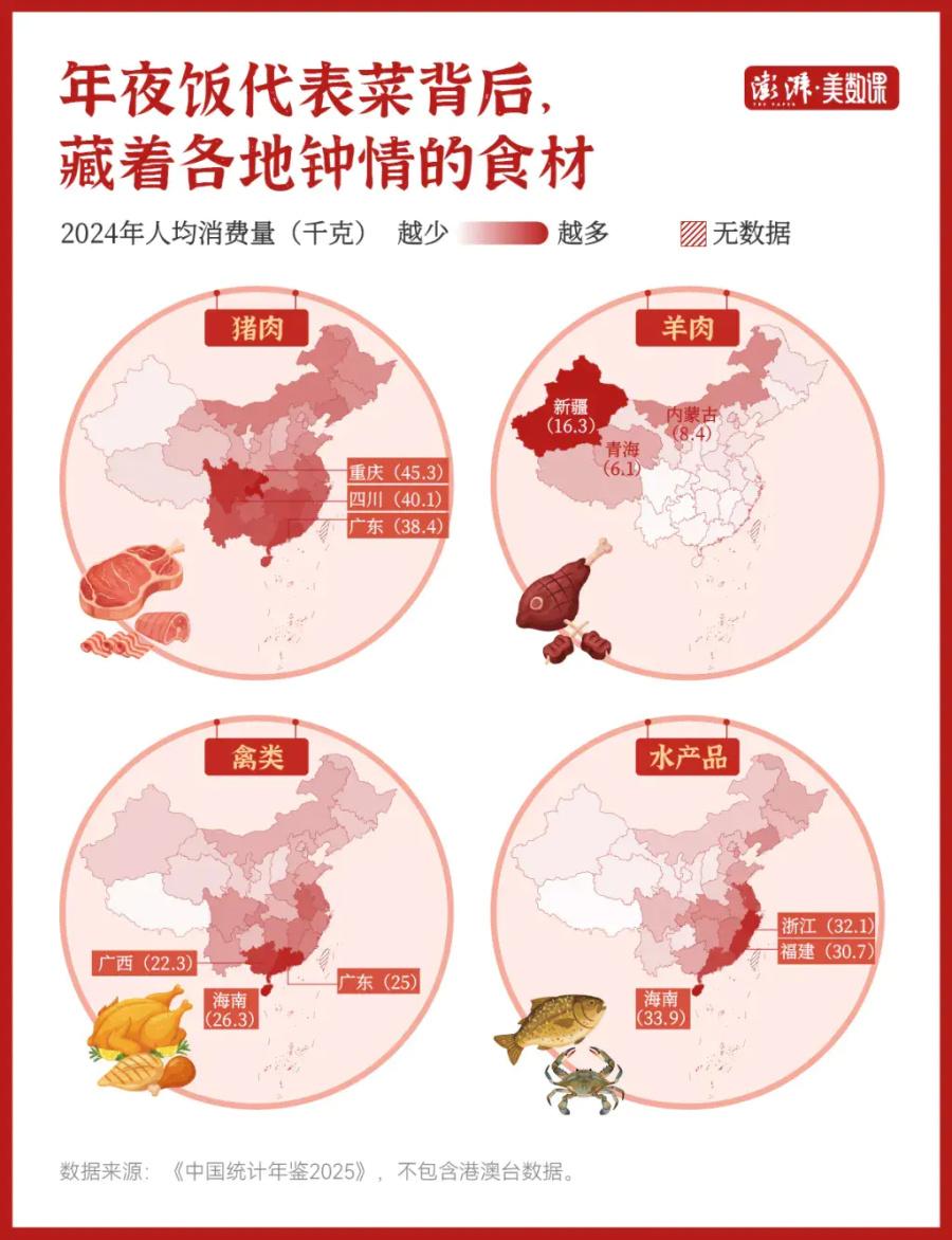 中国各地年夜饭的必吃硬菜可太有讲究了。北方硬菜主打豪迈与暖意。东北有小鸡炖蘑菇,散养土鸡和榛蘑慢炖,寓意“大吉大利”,还有杀猪菜,热气腾腾象征全家红火;华北的四喜丸子象征“福禄寿喜”,酱肘子寓意“手到财来”;西北的关中八大碗,像带把肘子,寓意“有头有脸、富足有余”。 南方硬菜则注重鲜甜与精致。广东的白切鸡象征“大吉大利”,盆菜层层堆叠鲍参翅肚,寓意“盆满钵满”;浙江的蟹炒年糕寓意“年年高升”。川渝地区烧白(扣肉)热度高,2024年重庆人均猪肉消费量达45.3千克。此外,少数民族也有独特年夜硬菜,像贵州水族的“鱼包韭菜”,广西毛南族的“飞鸟粽”等。